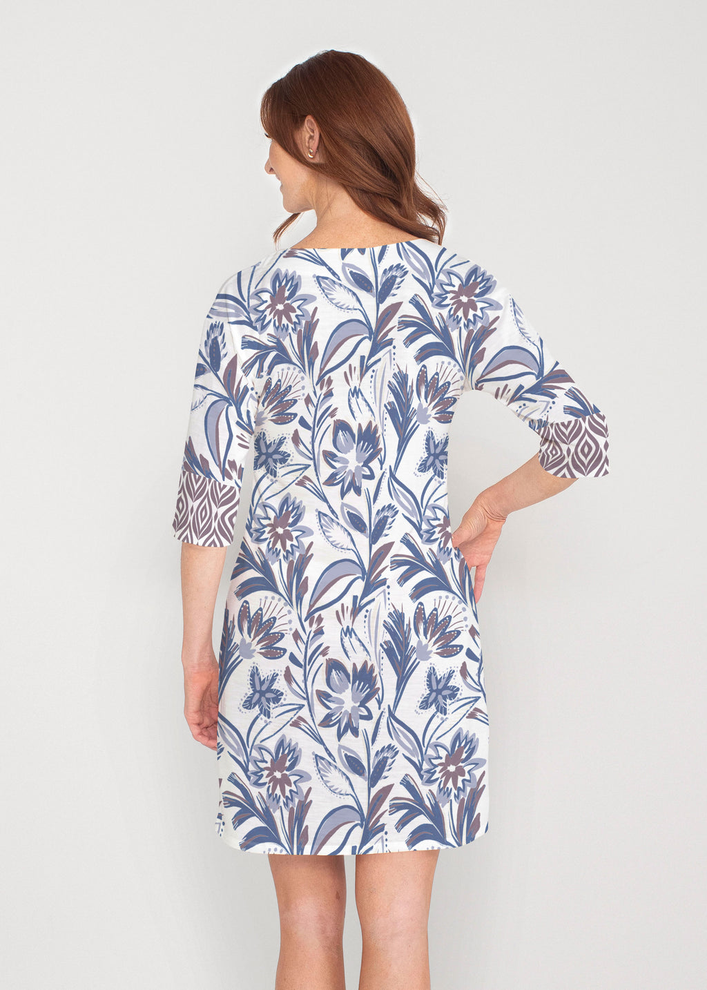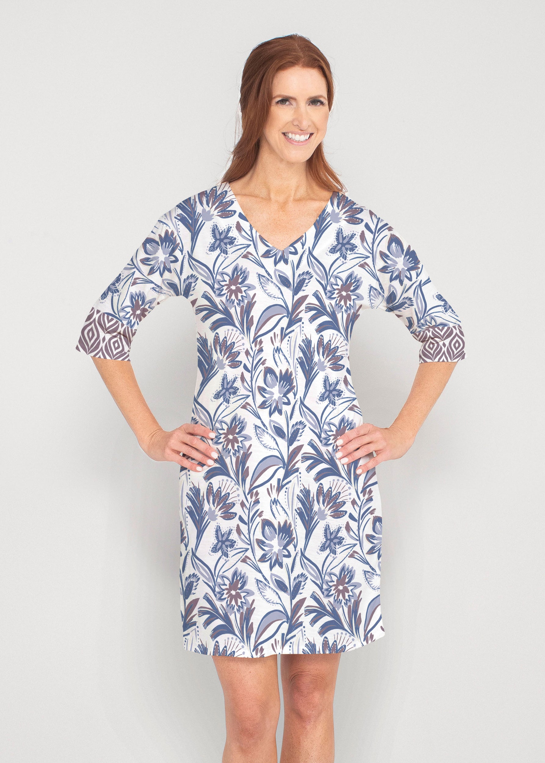 Be comfortable and fashionable all day in our light weight french terry fabric. This v-neck dress features loose 3/4 sleeves, drop shoulders and falls just at the knee.