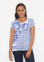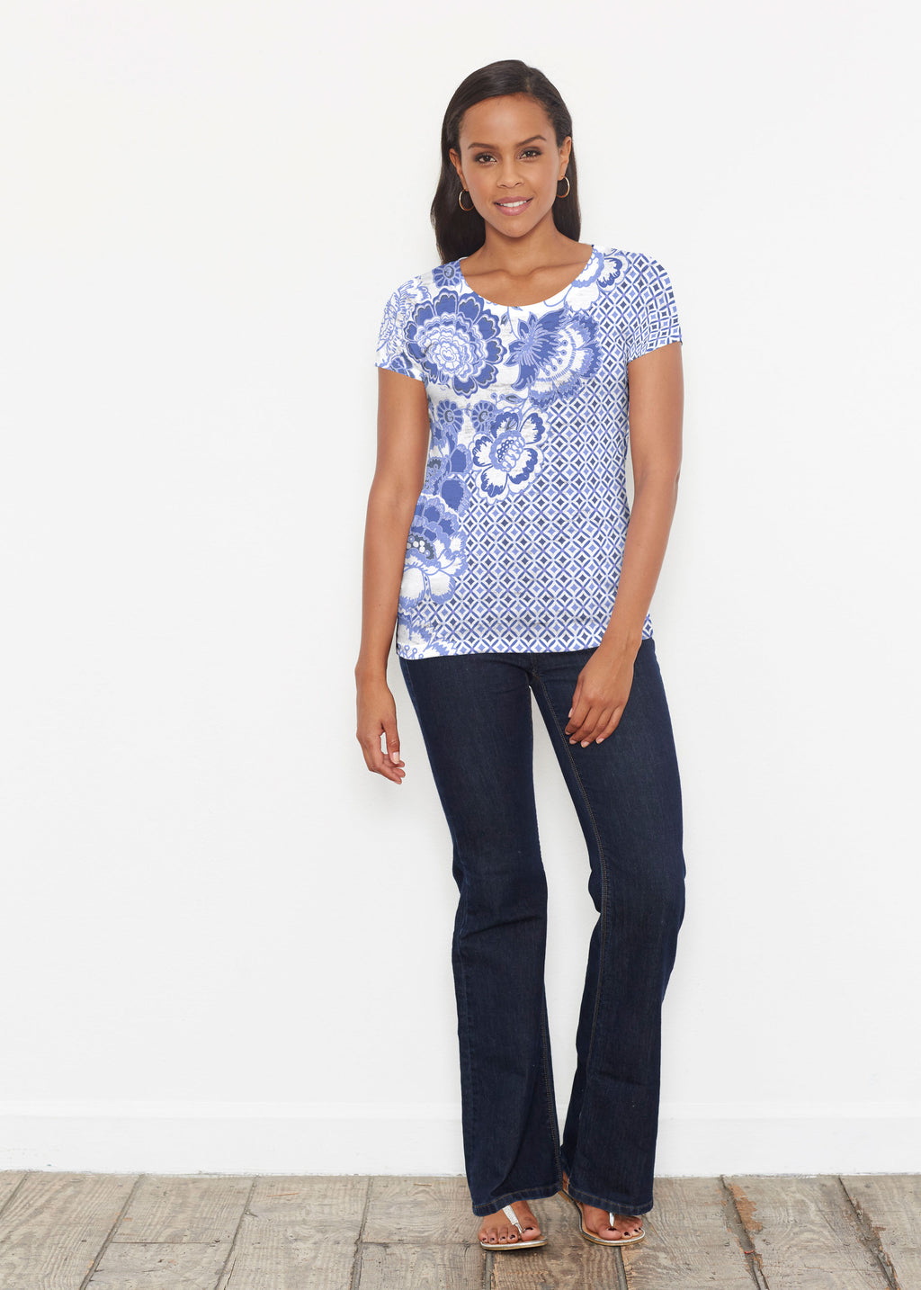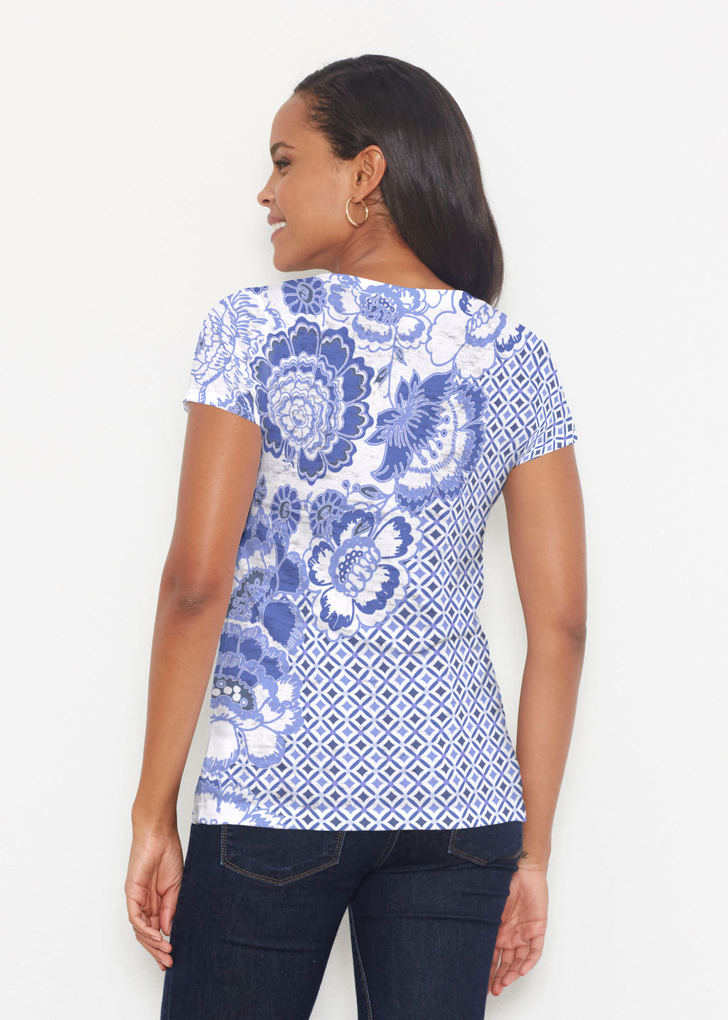 A pop of large and small scaled blue florals crossing over the shoulder to a small geo design with the same coordinating beautiful blues- Designed by Susan Werner
