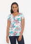 A bold burst of abstract florals and leopard spots in vibrant shades of teal, turquoise, pink, red and green with larger patterns on the sleeves. Designed by Susan Werner.
