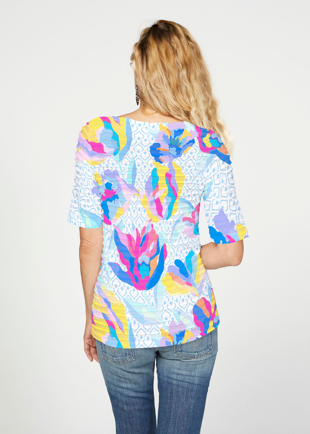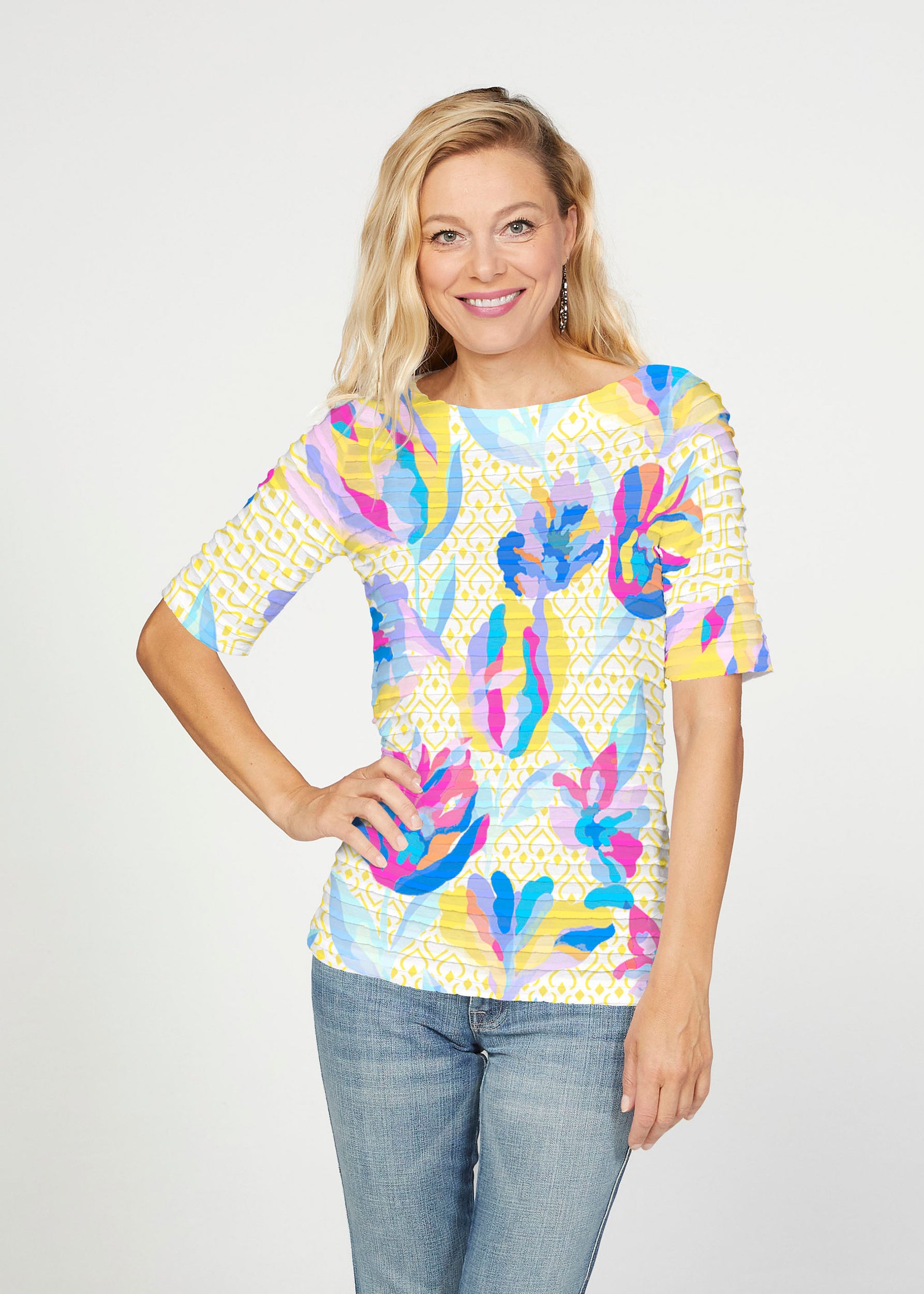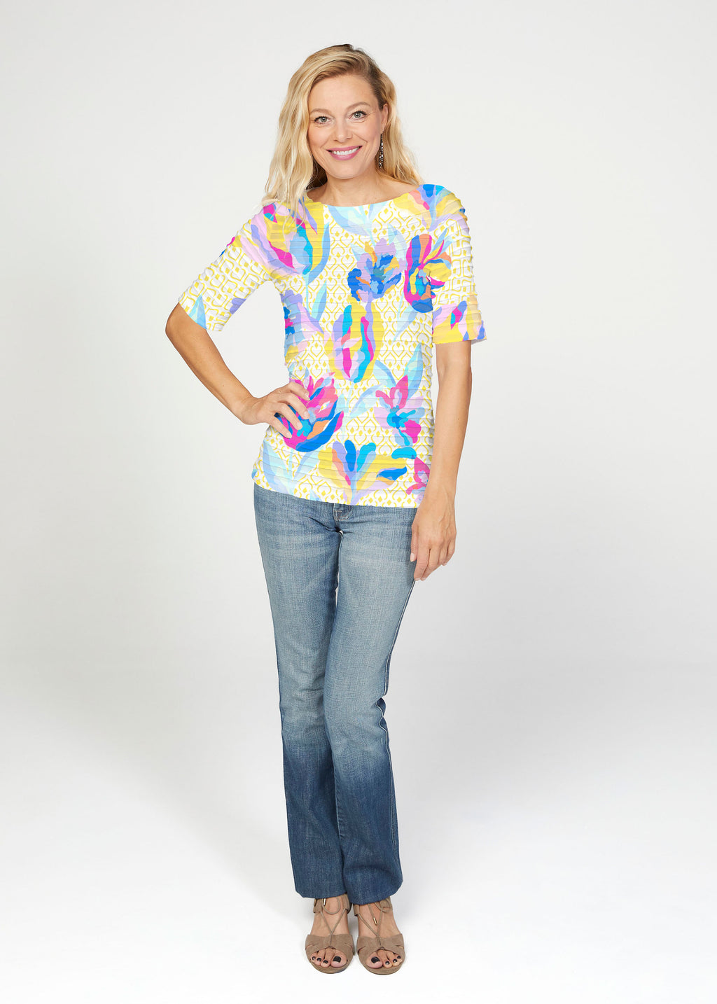 The uniquely soft, pleated texture in this Banded fabric gives the elbow sleeve and boat neck top a fun and sophisticated look. Easy relaxed fit with a hemline that comes below the hip.
