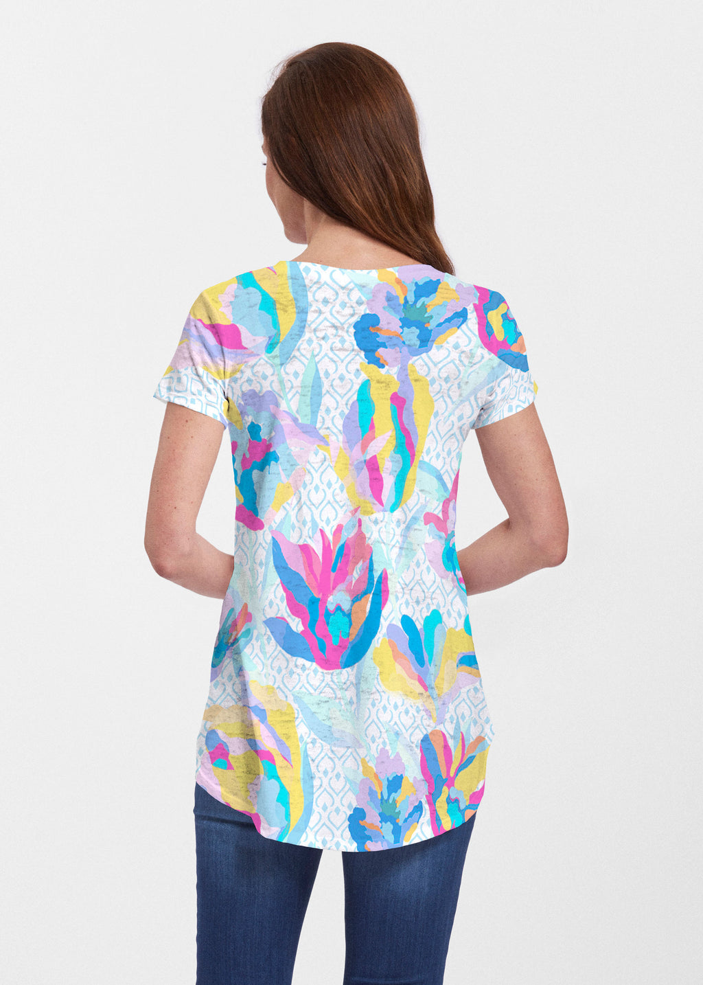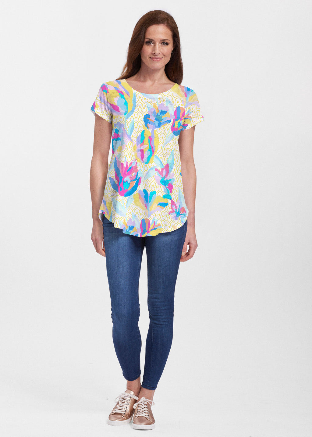 An effortlessly flattering tunic in our soft Signature burnout fabric featuring short sleeves and a scoop neck with a body that flows into a full, swinging shirttail hem.