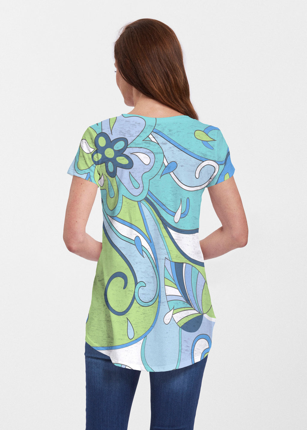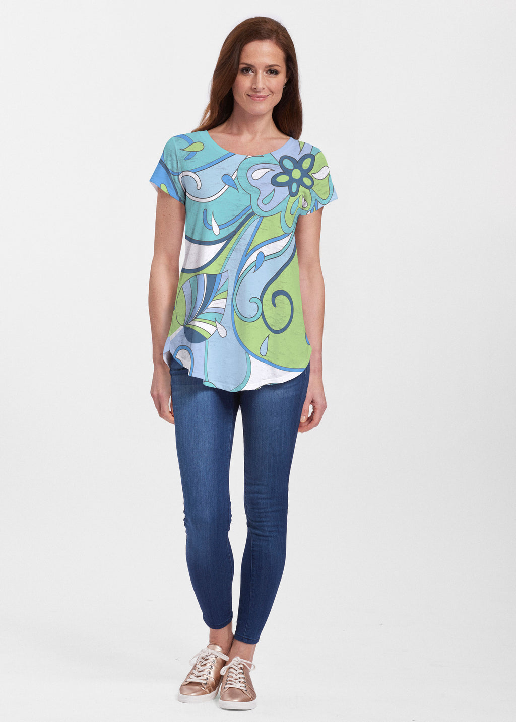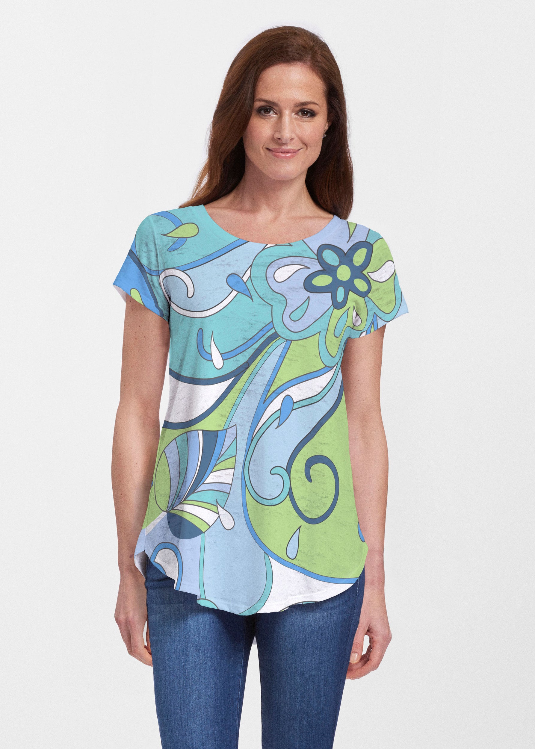 An effortlessly flattering tunic in our soft Signature burnout fabric featuring short sleeves and a scoop neck with a body that flows into a full, swinging shirttail hem.