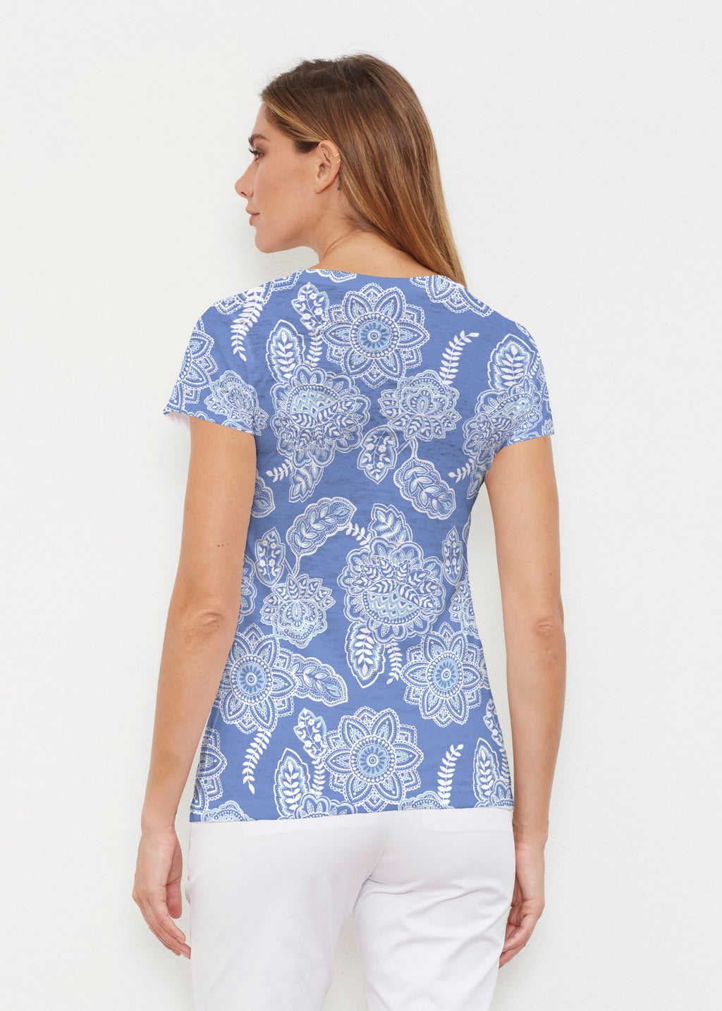 Created in soft, casual burn-out Signature blend, this tee features a subtle v-neck and cap sleeves.