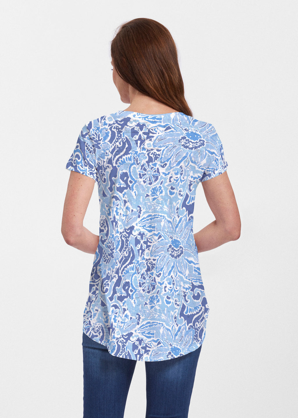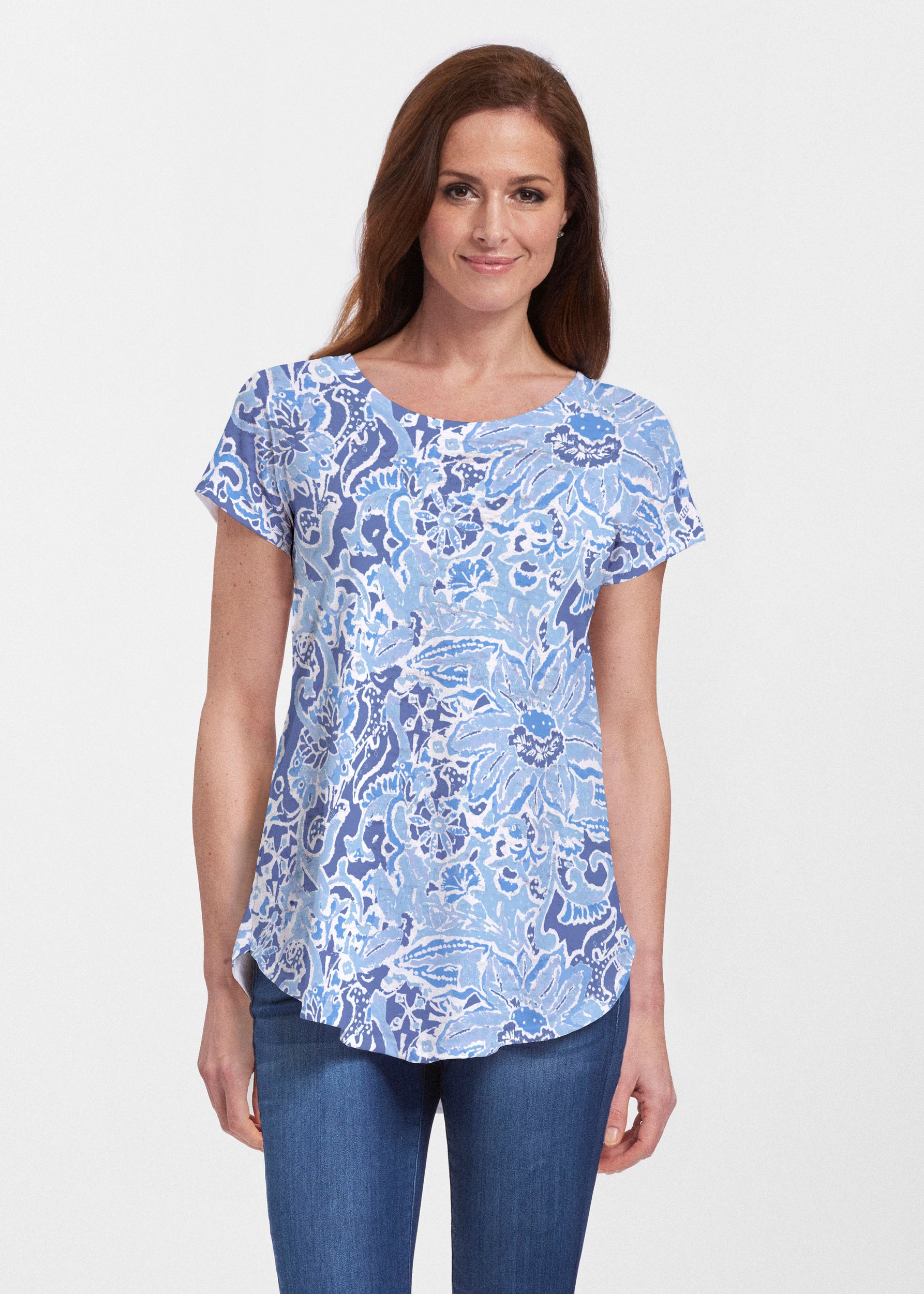 An effortlessly flattering tunic in our soft Signature burnout fabric featuring short sleeves and a scoop neck with a body that flows into a full, swinging shirttail hem.