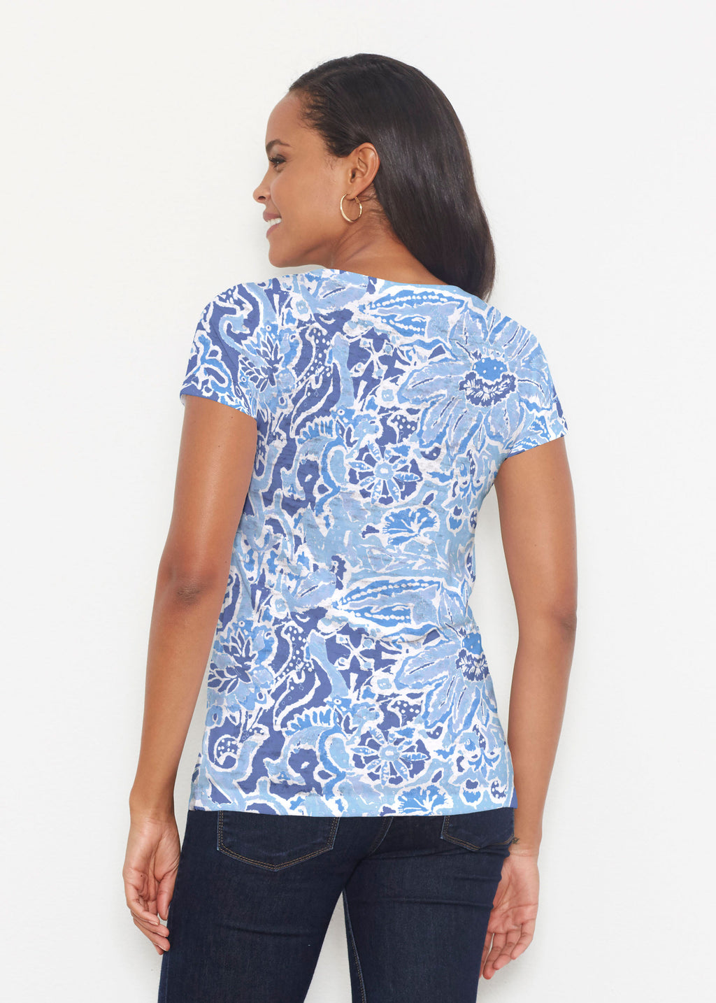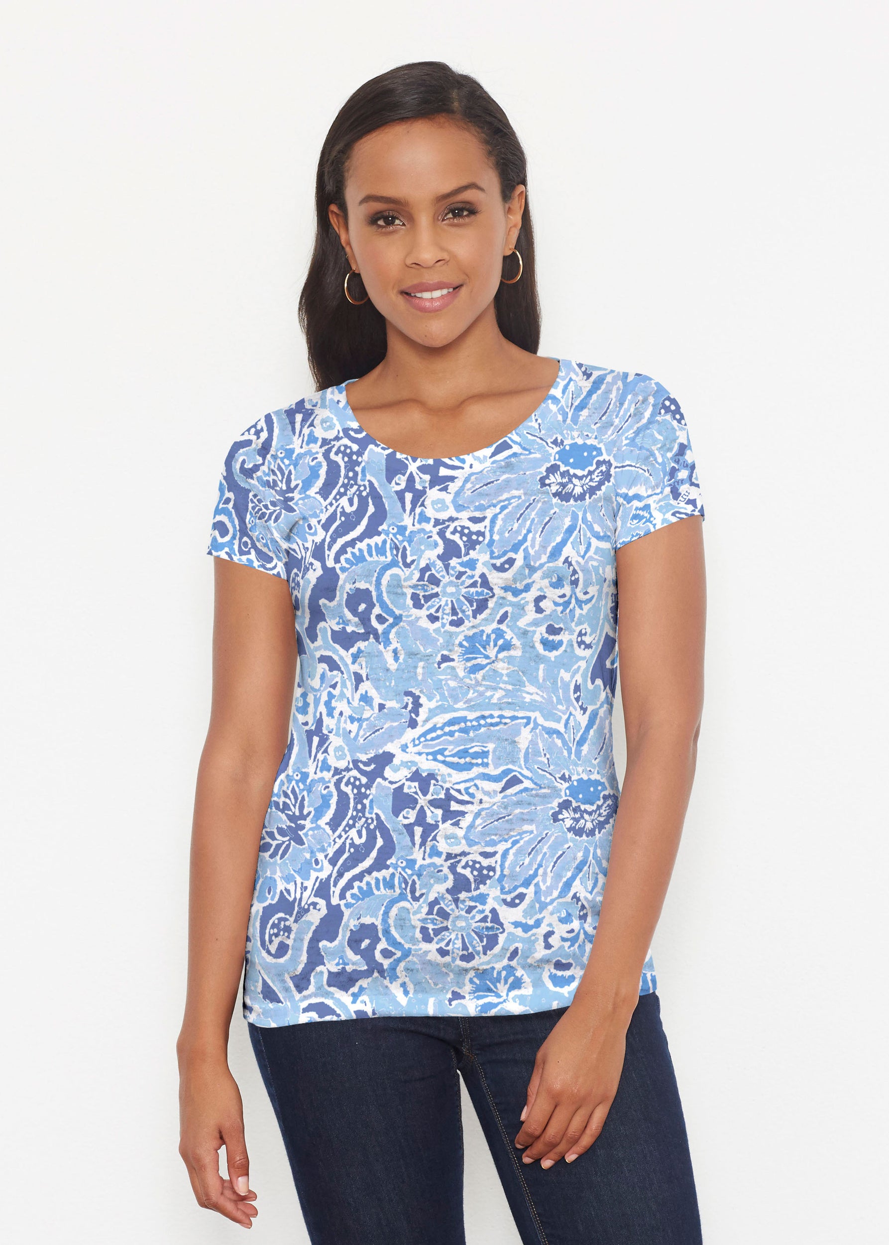Our scoop neck tee in our casual and supremely soft Signature burnout blend is a best-selling collectible! A relaxed fit falls at the hip.