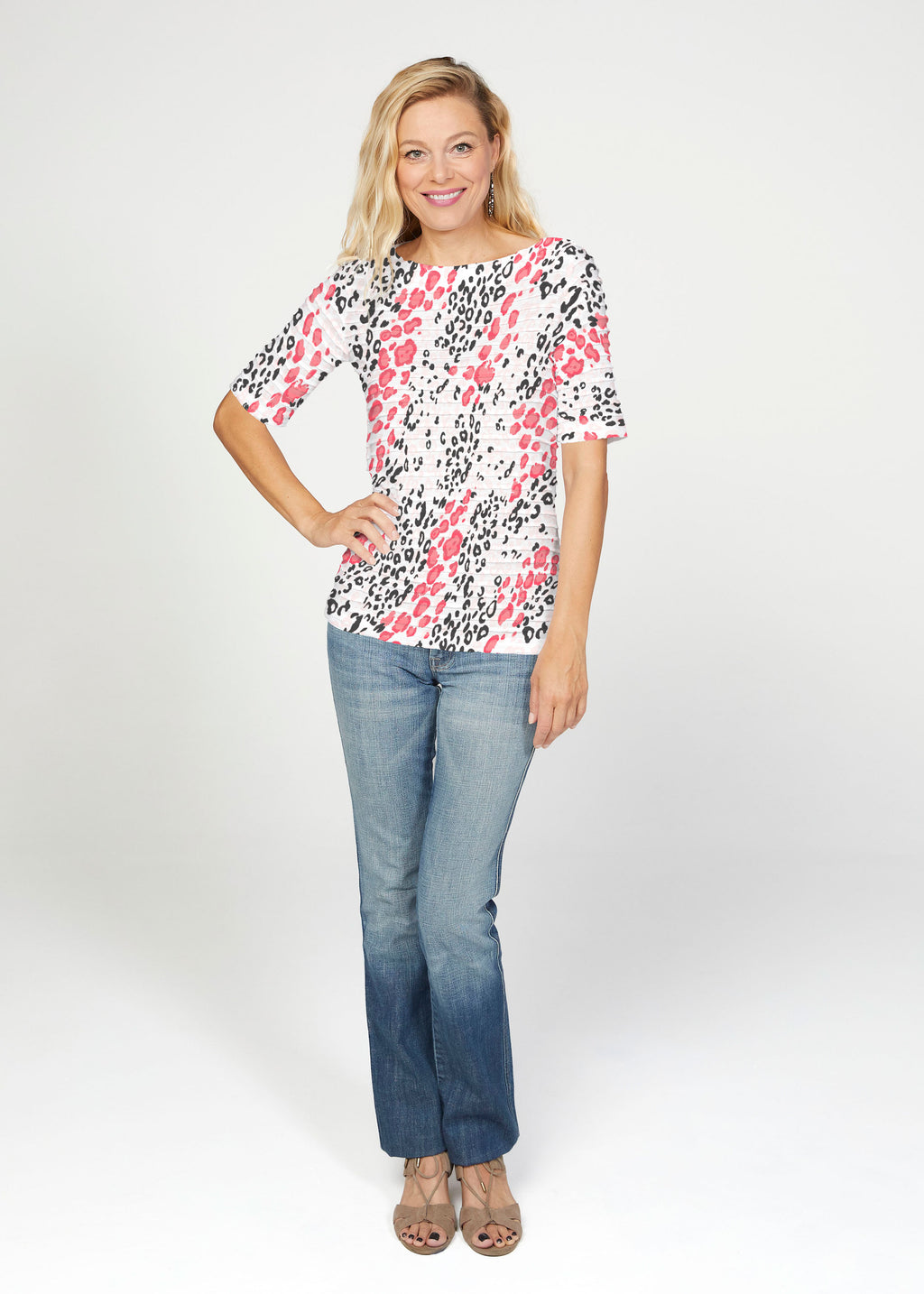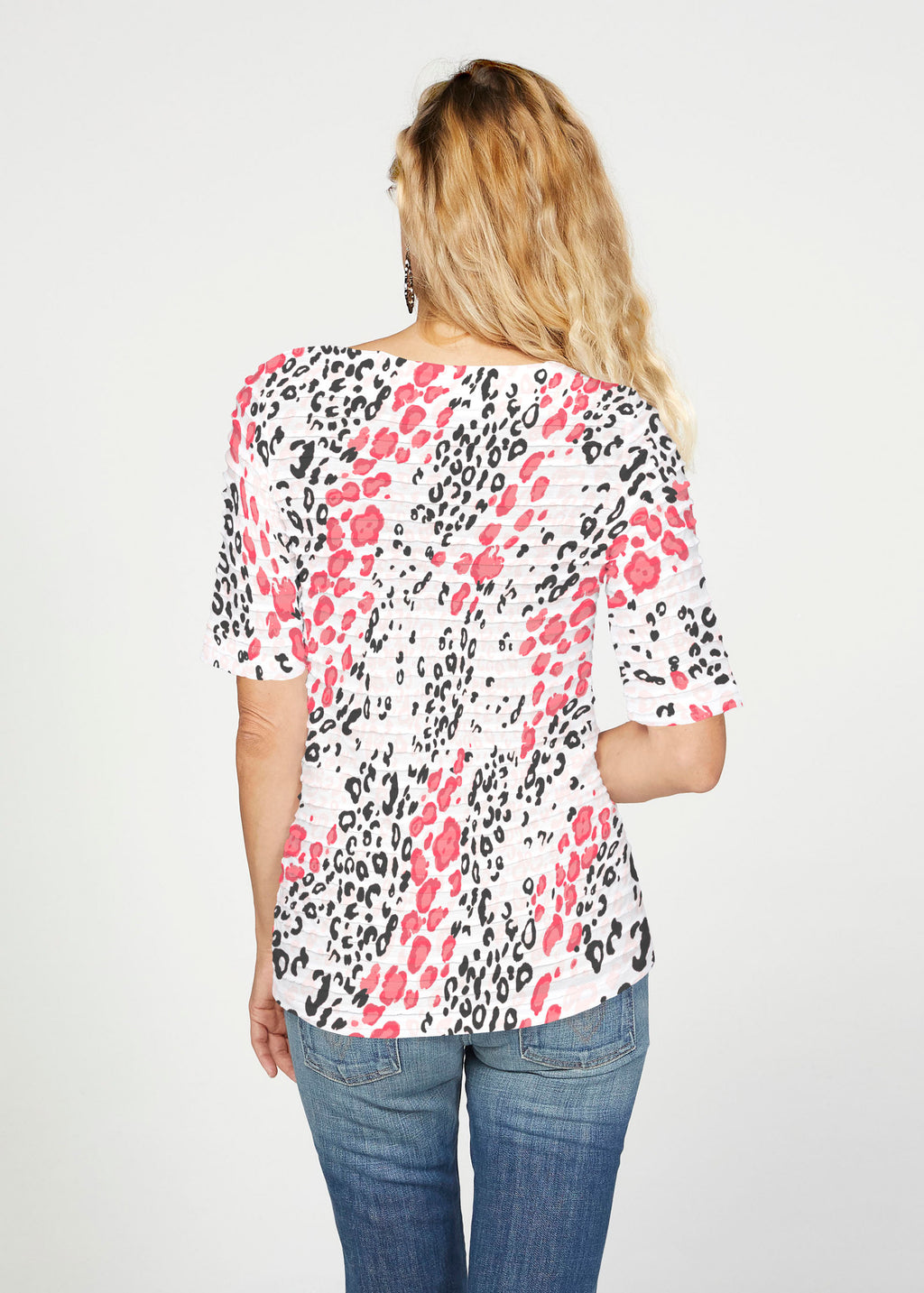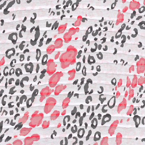 A fun yet sophisticated mixed print with bands of abstract leopard spots in pink, red, black and white with a classic Greek Key pattern on the sleeve ends. Designed by Susan Werner.