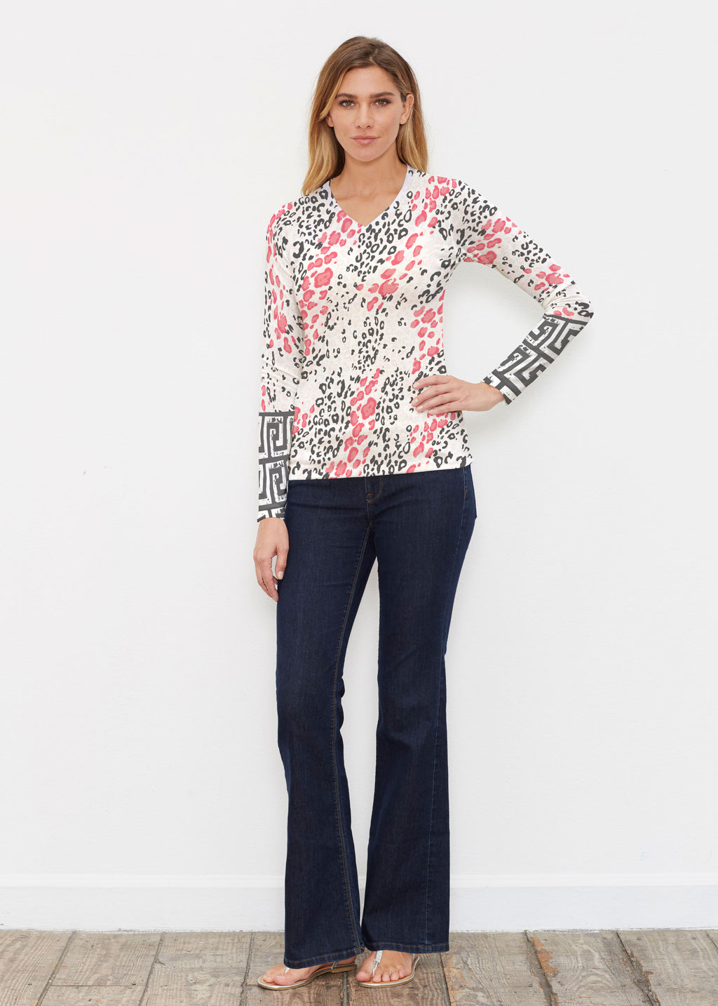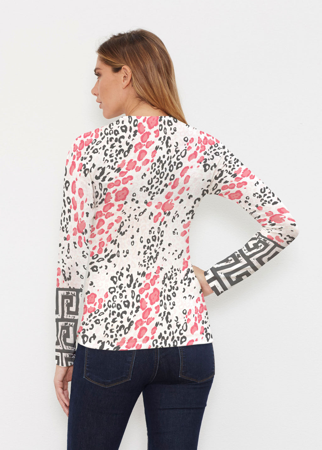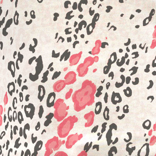 A fun yet sophisticated mixed print with bands of abstract leopard spots in pink, red, black and white with a classic Greek Key pattern on the sleeve ends. Designed by Susan Werner.
