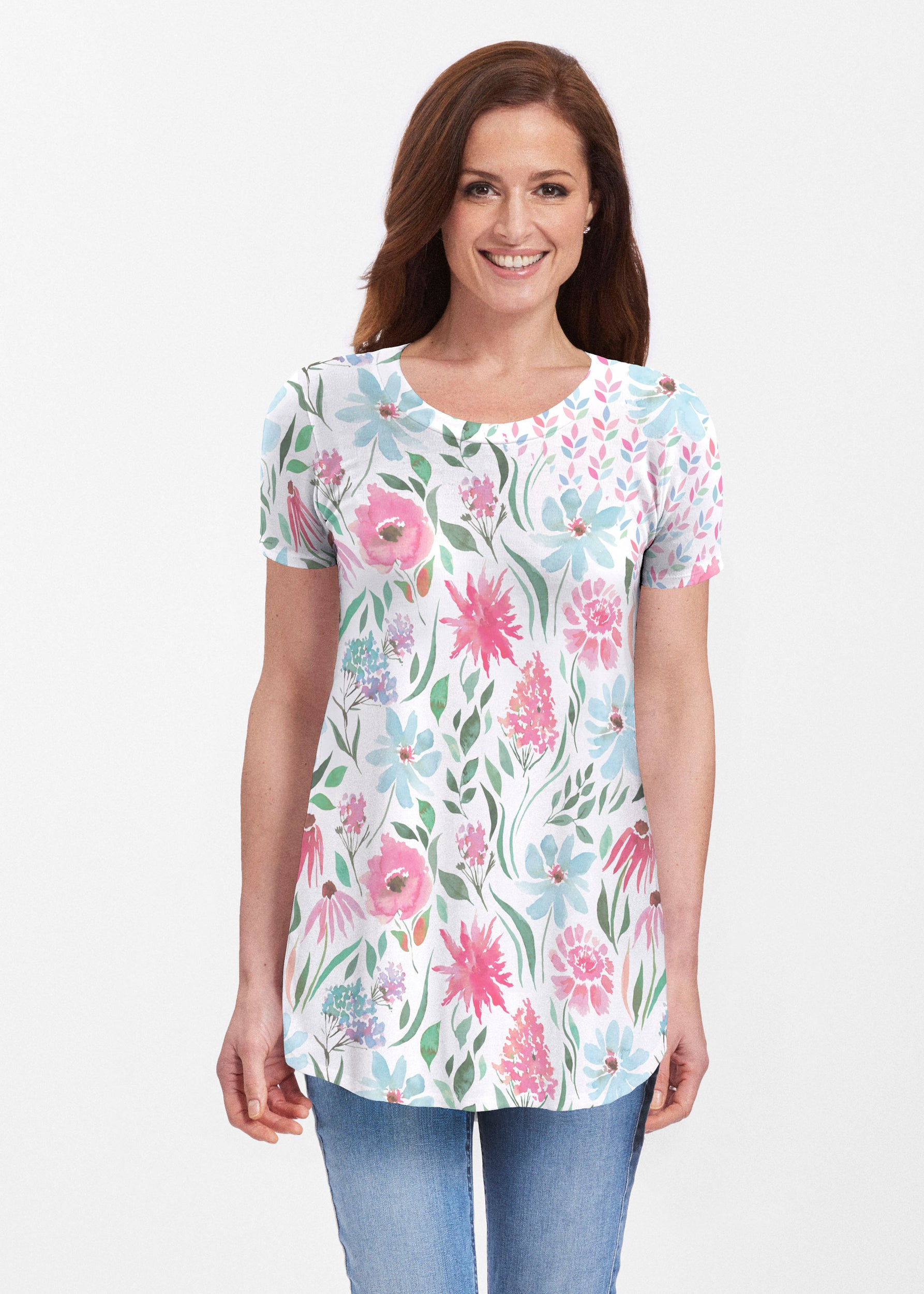 Our soft and feminine short sleeve silhouette tunic is sure to flatter any figure. Made in our Butterknit fabic that flows into a relaxed curved hem that is slightly longer in the back with subtle side slits.