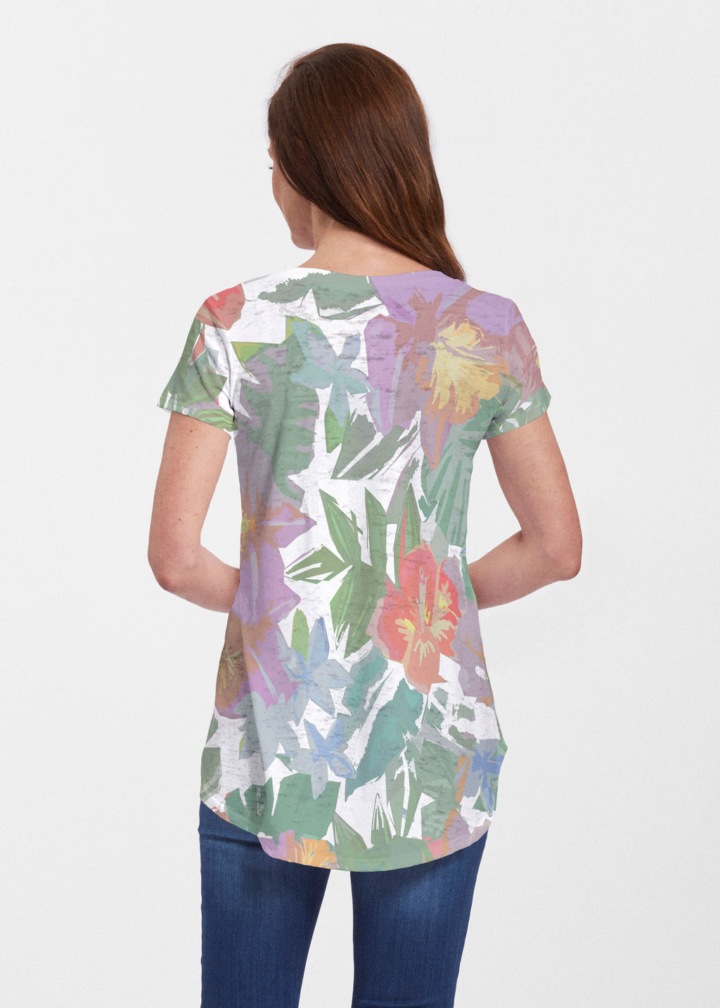 An effortlessly flattering tunic in our soft Signature burnout fabric featuring short sleeves and a scoop neck with a body that flows into a full, swinging shirttail hem.