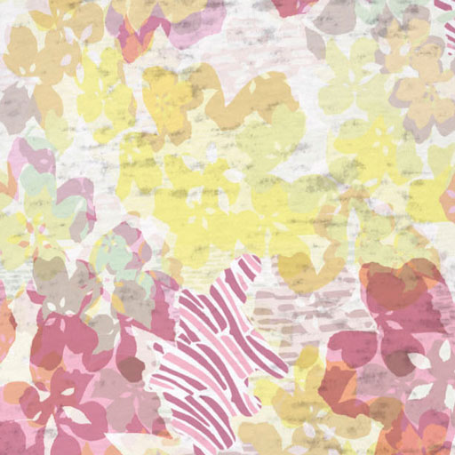 A summery array of red, pink and yellow flowers on a white canvas with pops of a red, pink and white linear print.