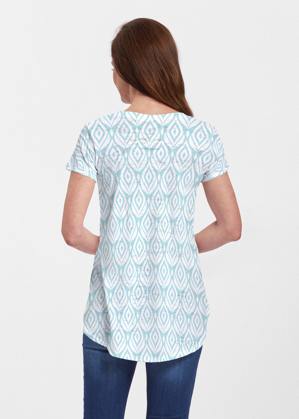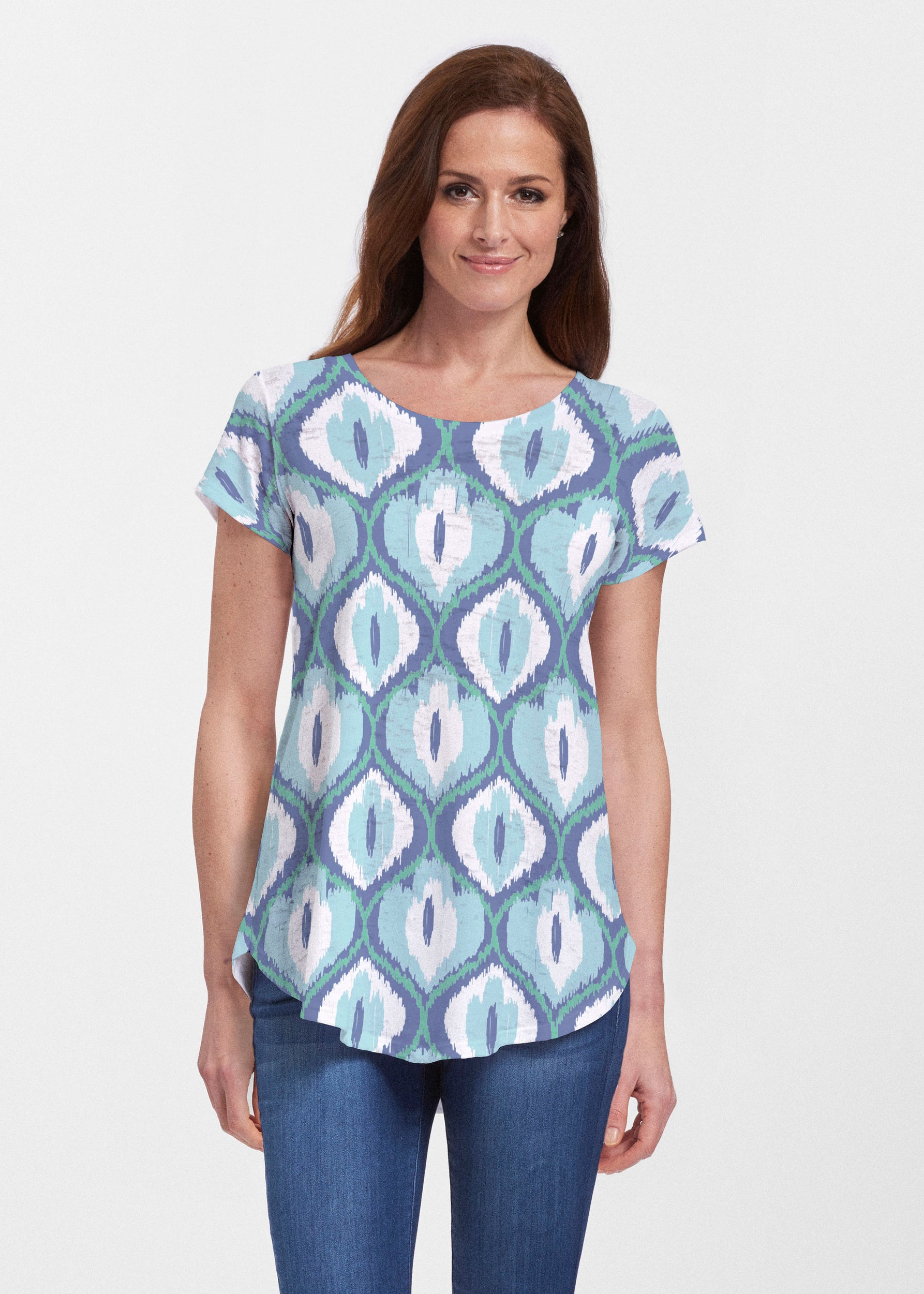 An effortlessly flattering tunic in our soft Signature burnout fabric featuring short sleeves and a scoop neck with a body that flows into a full, swinging shirttail hem.