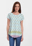 A summery tapestry print of turquoise and purple with a vibrant border design.