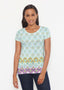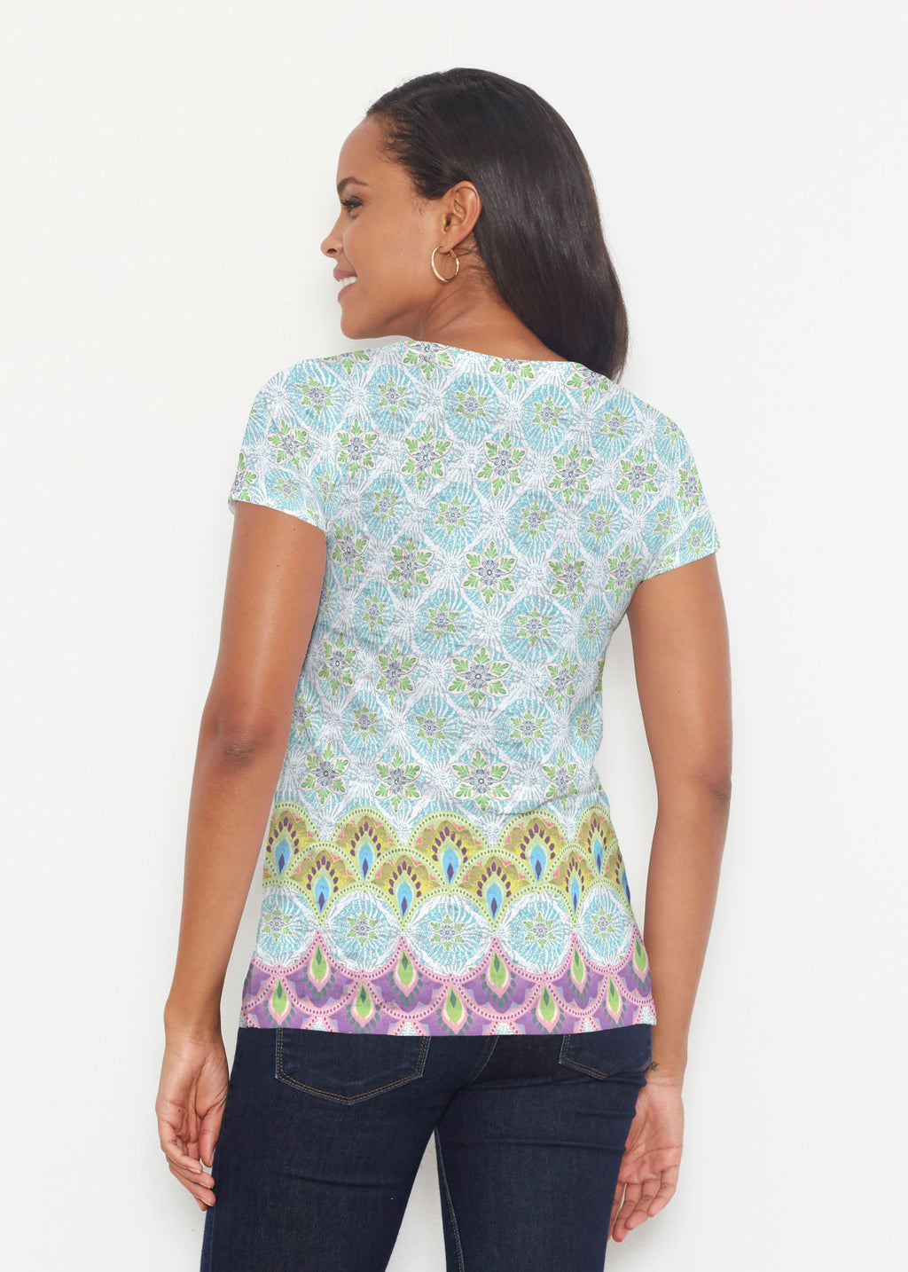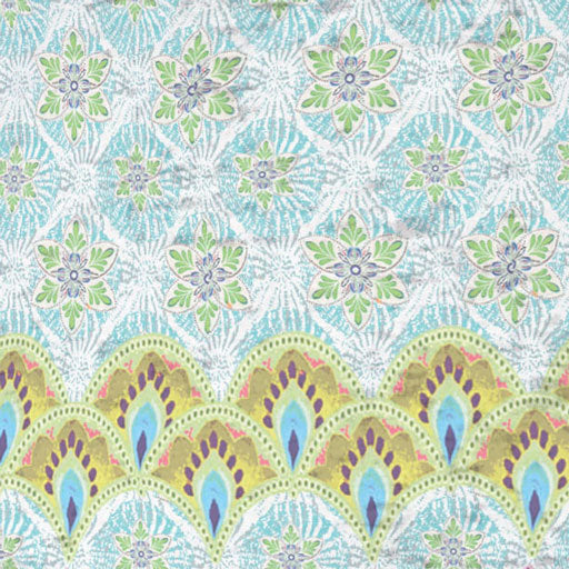 A summery tapestry print of turquoise and purple with a vibrant border design.