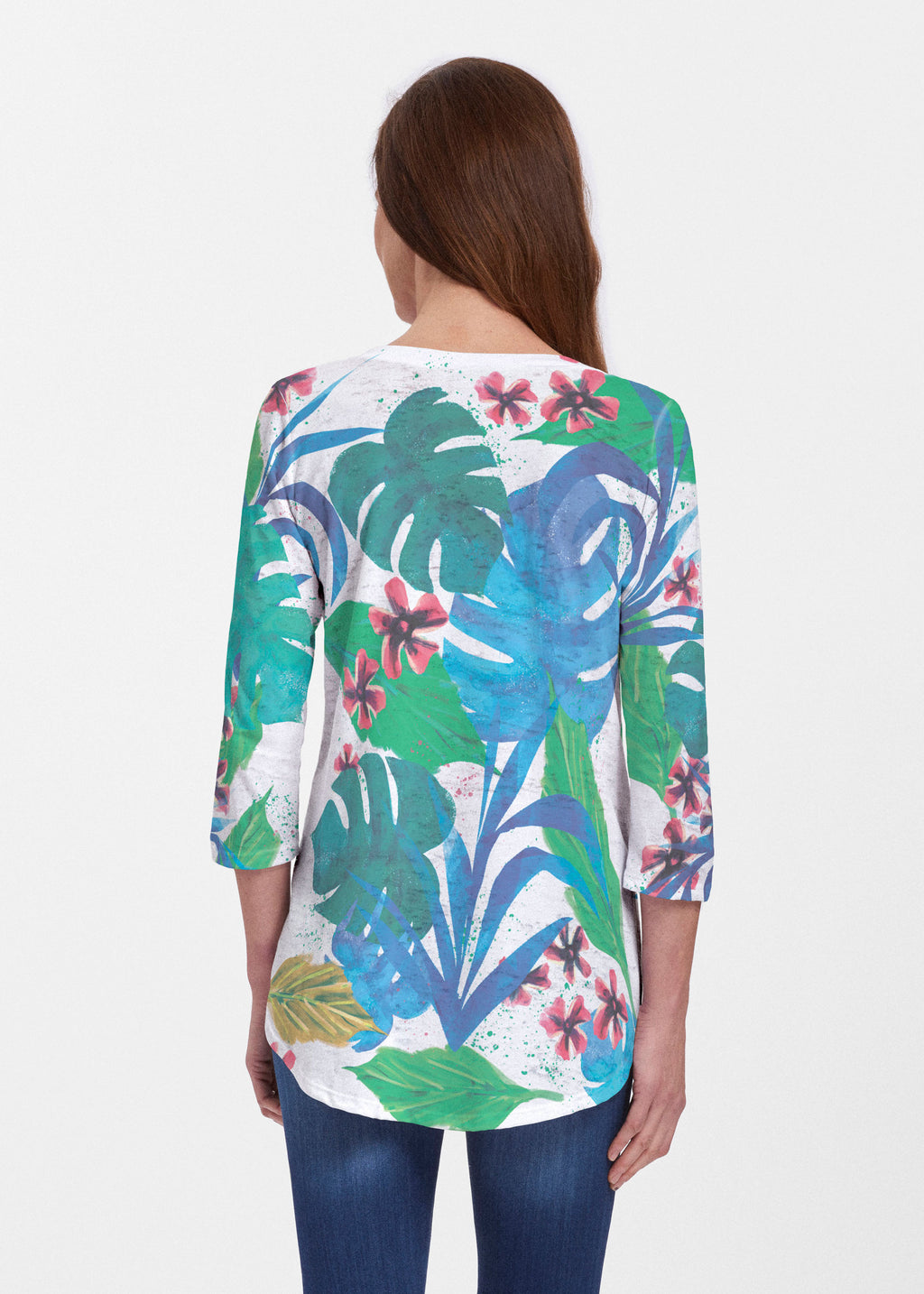 This v-neck tunic in our Signature burnout fabric is forever flattering. 3/4 sleeves and a v-neck flow into a full, swinging shirttail hem.