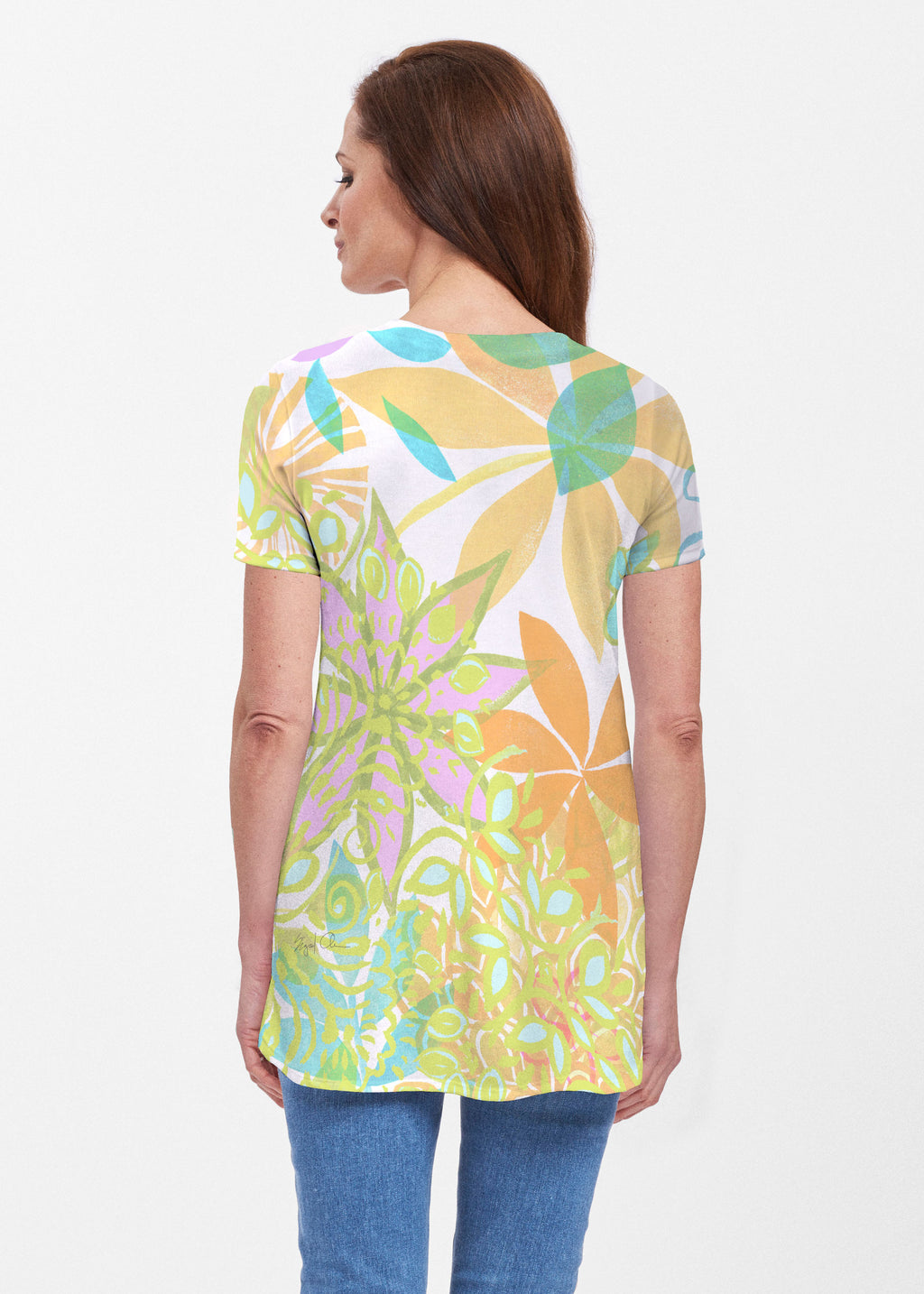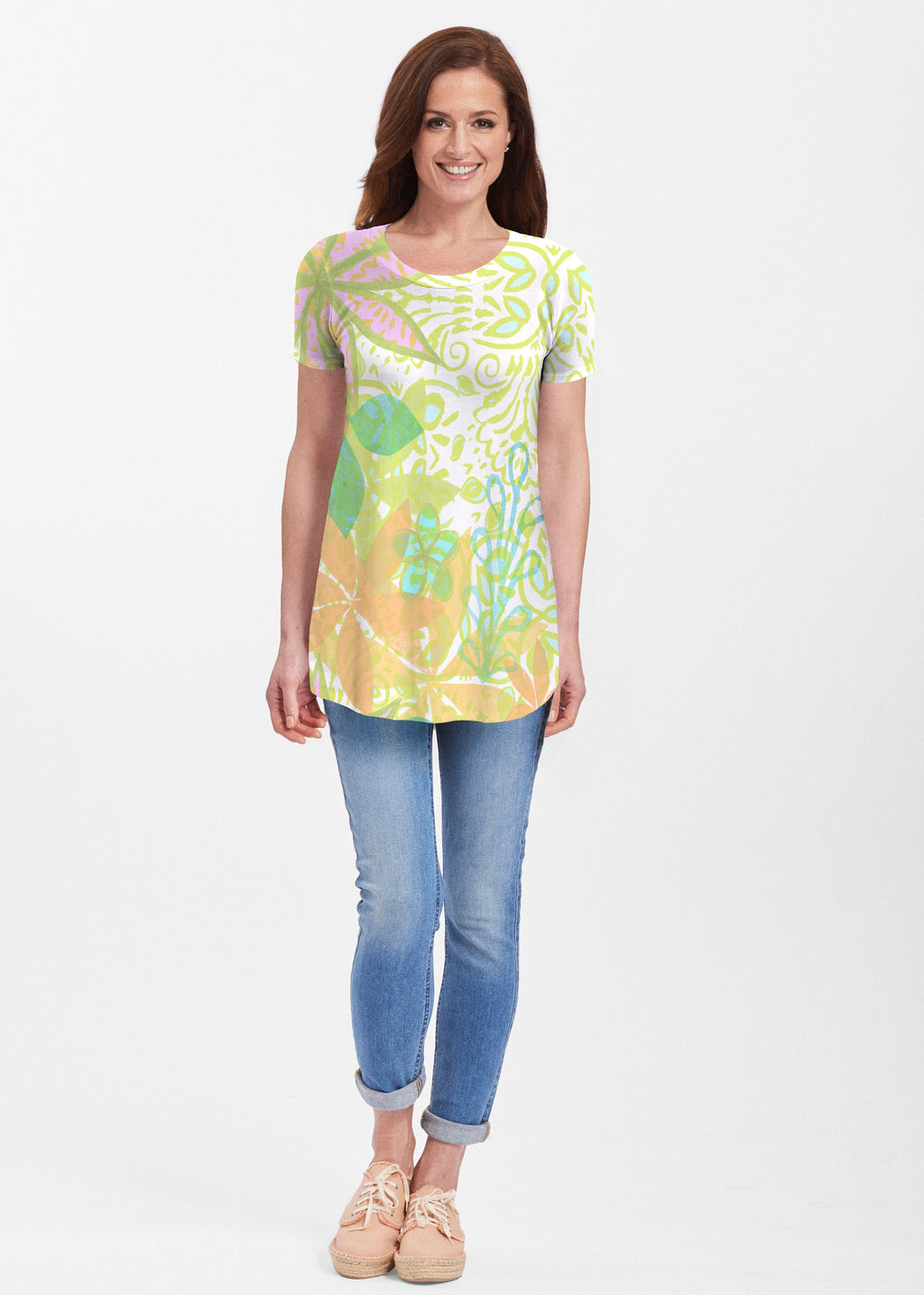 Our soft and feminine short sleeve silhouette tunic is sure to flatter any figure. Made in our Butterknit fabic that flows into a relaxed curved hem that is slightly longer in the back with subtle side slits.