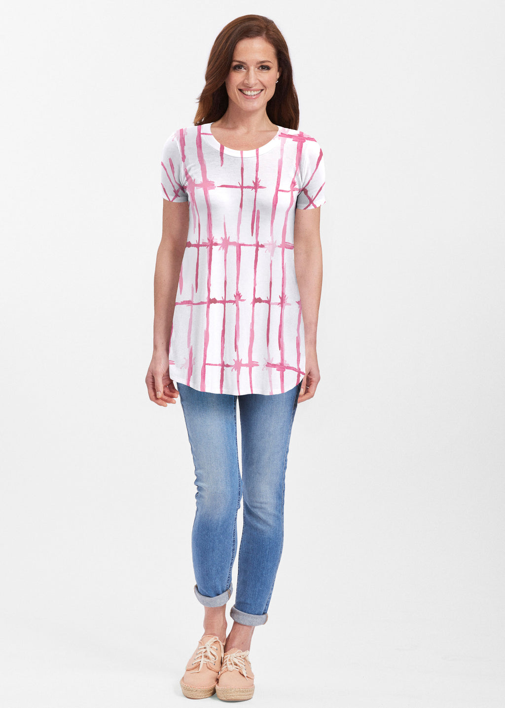 Our soft and feminine short sleeve silhouette tunic is sure to flatter any figure. Made in our Butterknit fabic that flows into a relaxed curved hem that is slightly longer in the back with subtle side slits.
