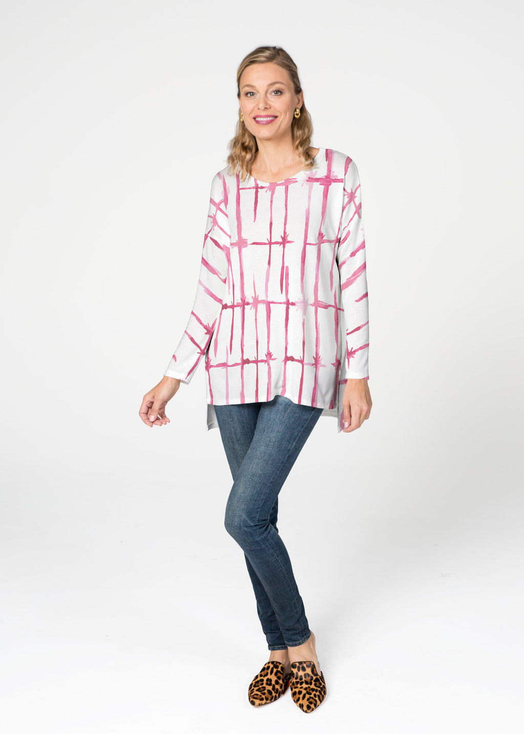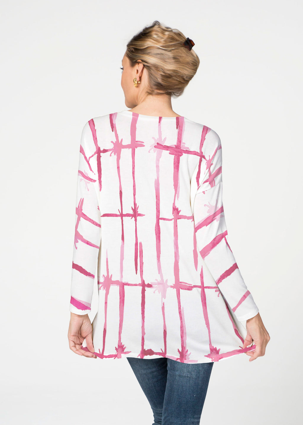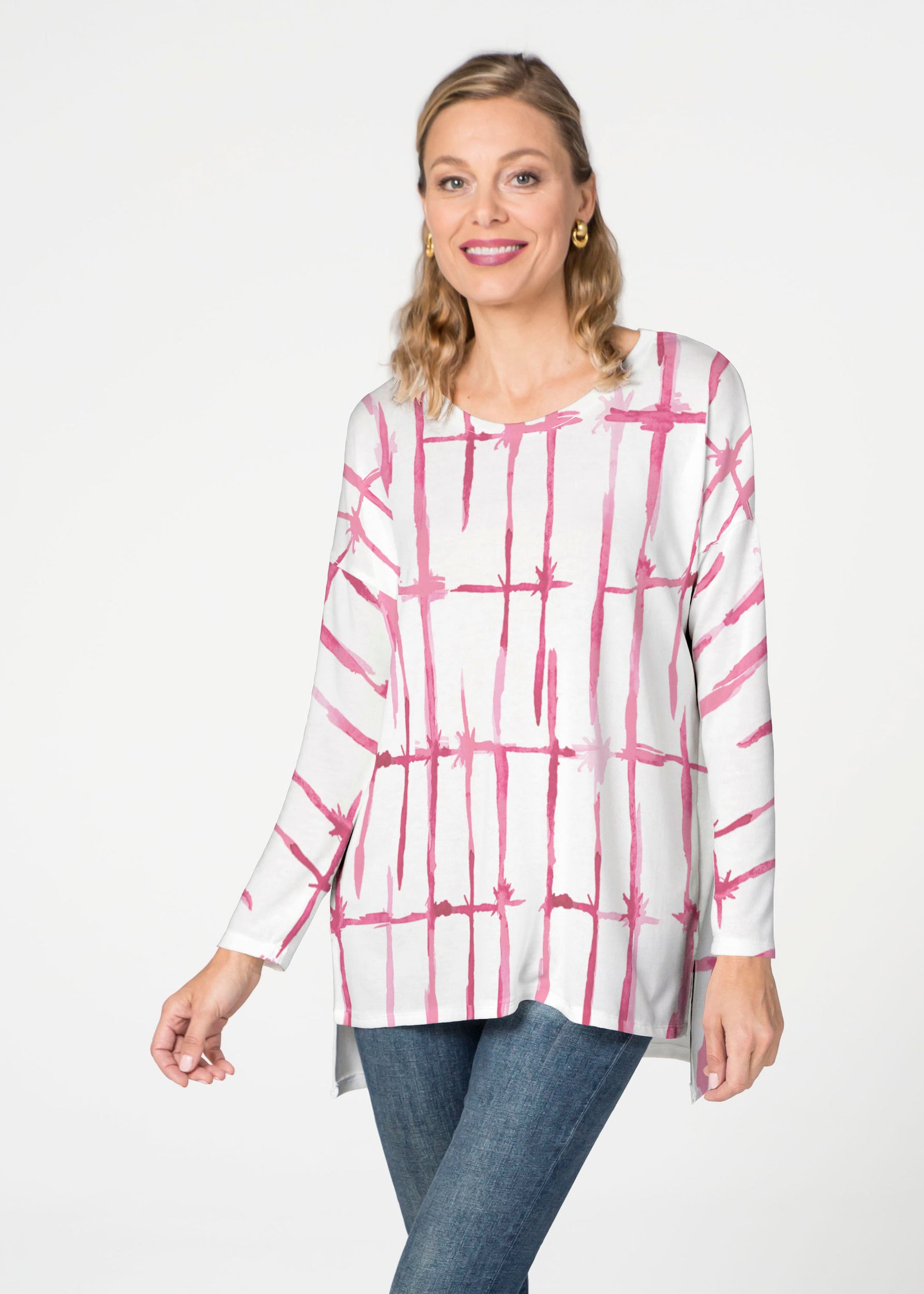 A stunning textured linear check design in pink and white, designed by Susan Werner.