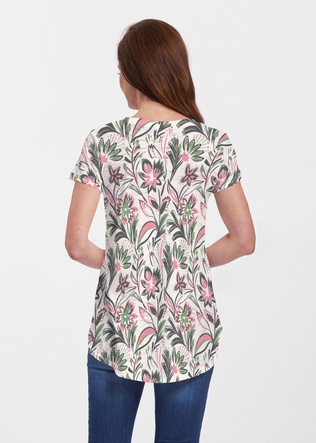 An effortlessly flattering tunic in our soft Signature burnout fabric featuring short sleeves and a scoop neck with a body that flows into a full, swinging shirttail hem.