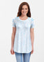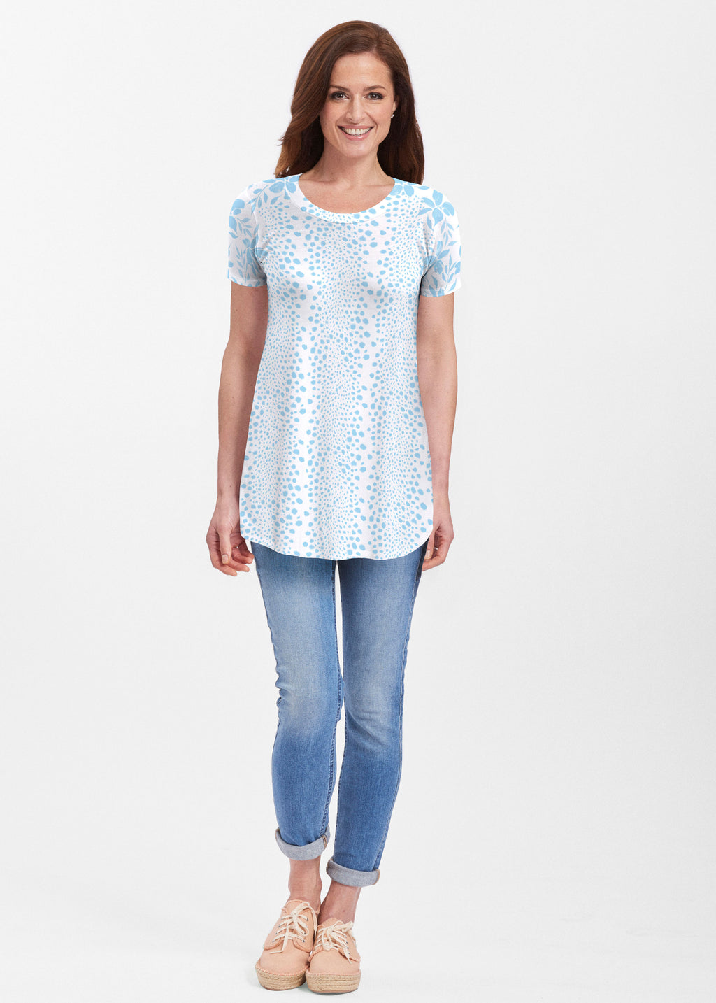 Our soft and feminine short sleeve silhouette tunic is sure to flatter any figure. Made in our Butterknit fabic that flows into a relaxed curved hem that is slightly longer in the back with subtle side slits.