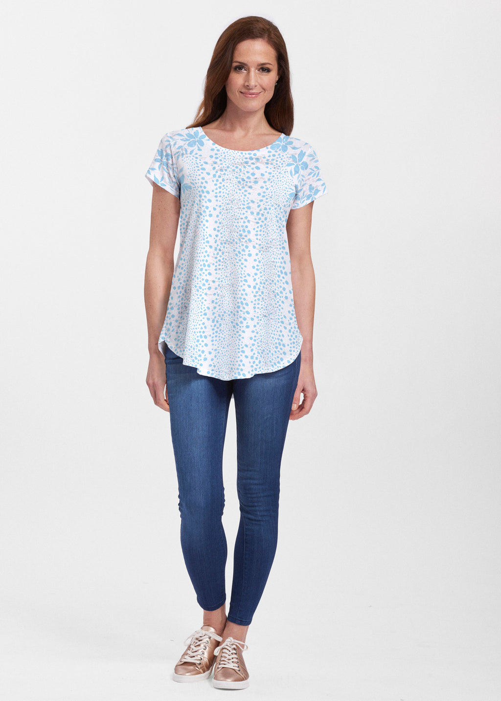 An effortlessly flattering tunic in our soft Signature burnout fabric featuring short sleeves and a scoop neck with a body that flows into a full, swinging shirttail hem.