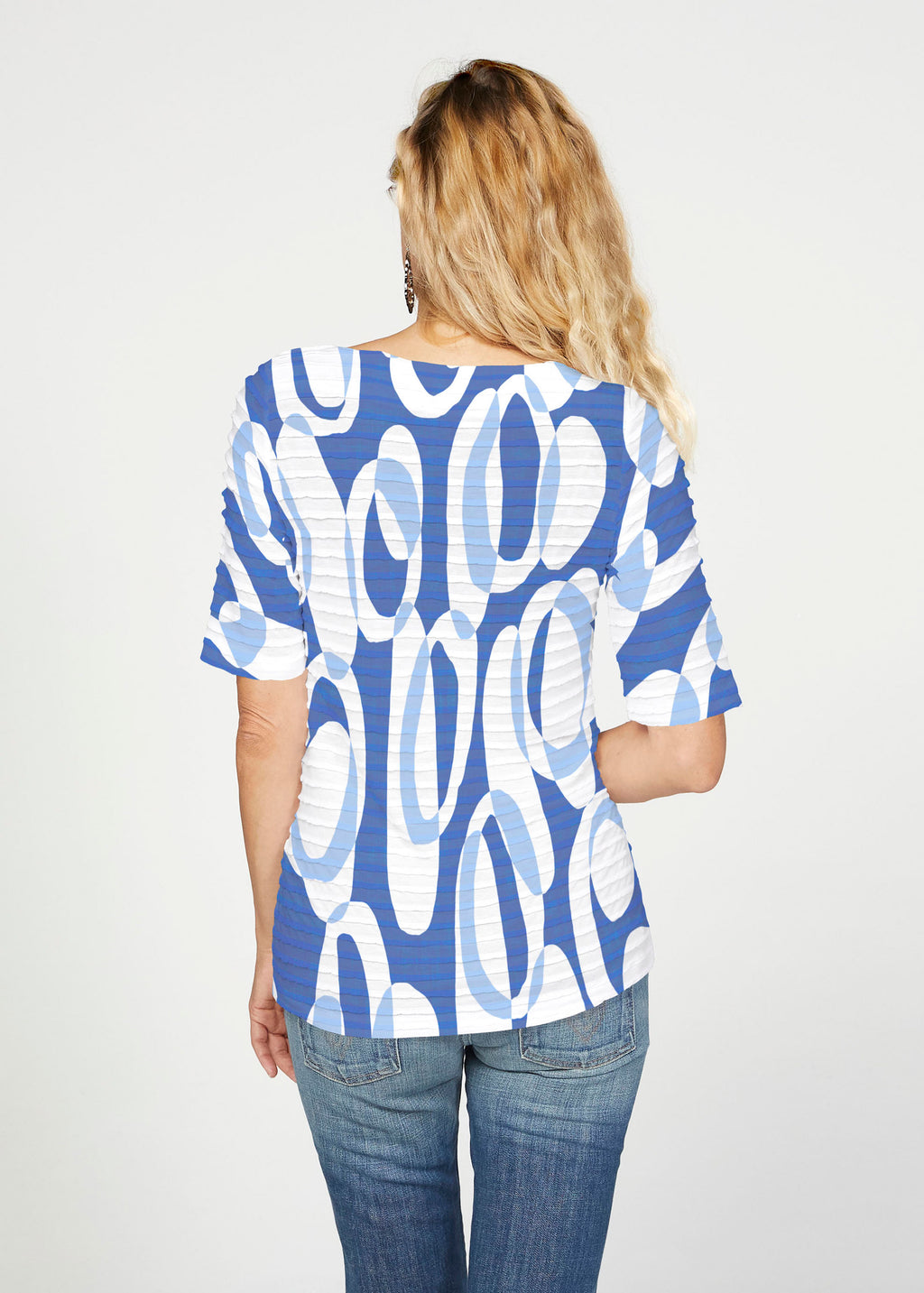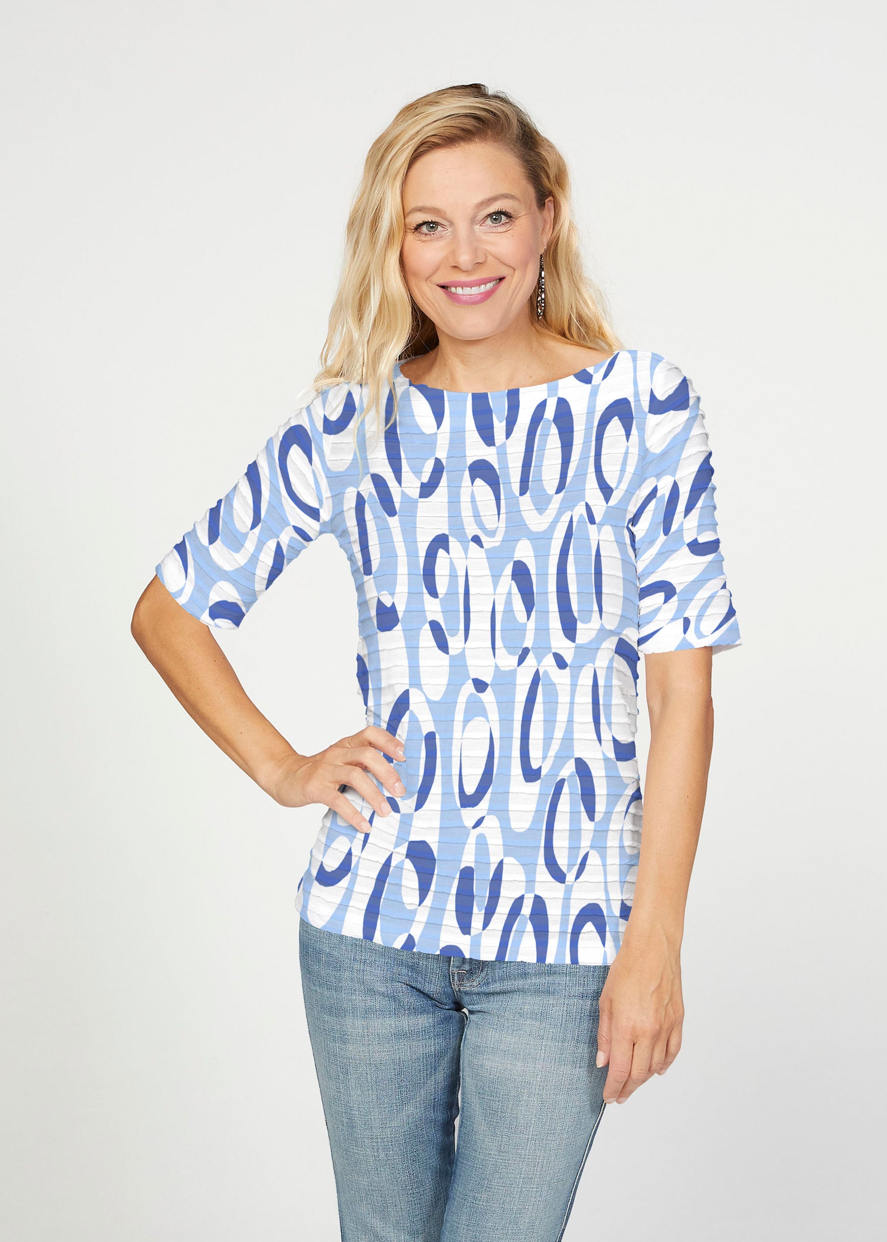 The uniquely soft, pleated texture in this Banded fabric gives the elbow sleeve and boat neck top a fun and sophisticated look. Easy relaxed fit with a hemline that comes below the hip.