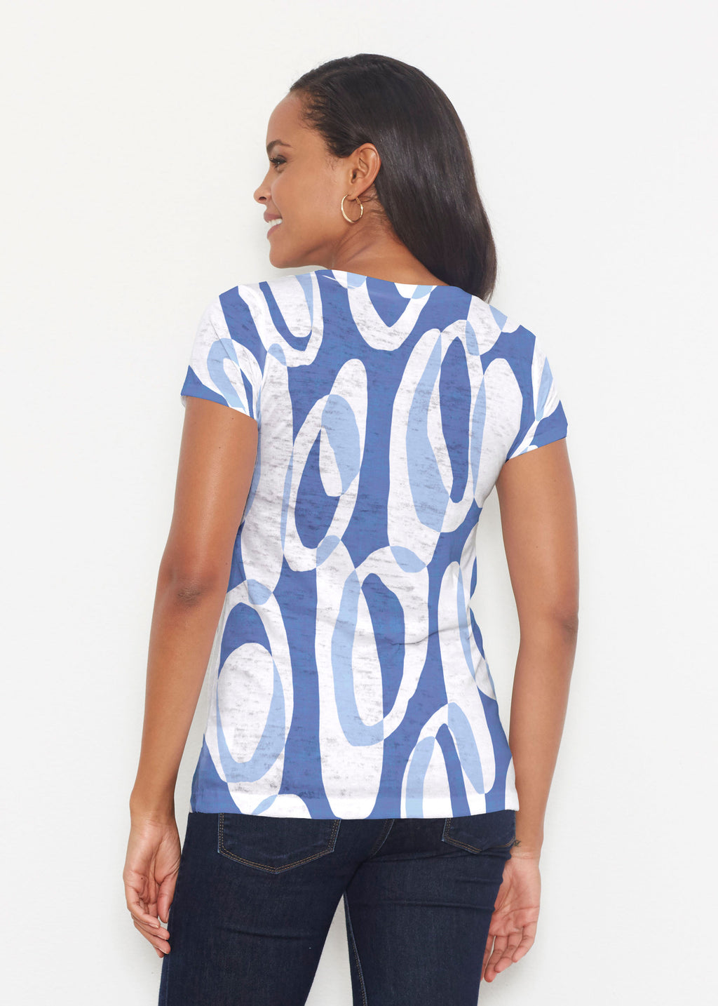 A fun geometrical pattern of overlapping whimsical loops of navy, light blue and white.