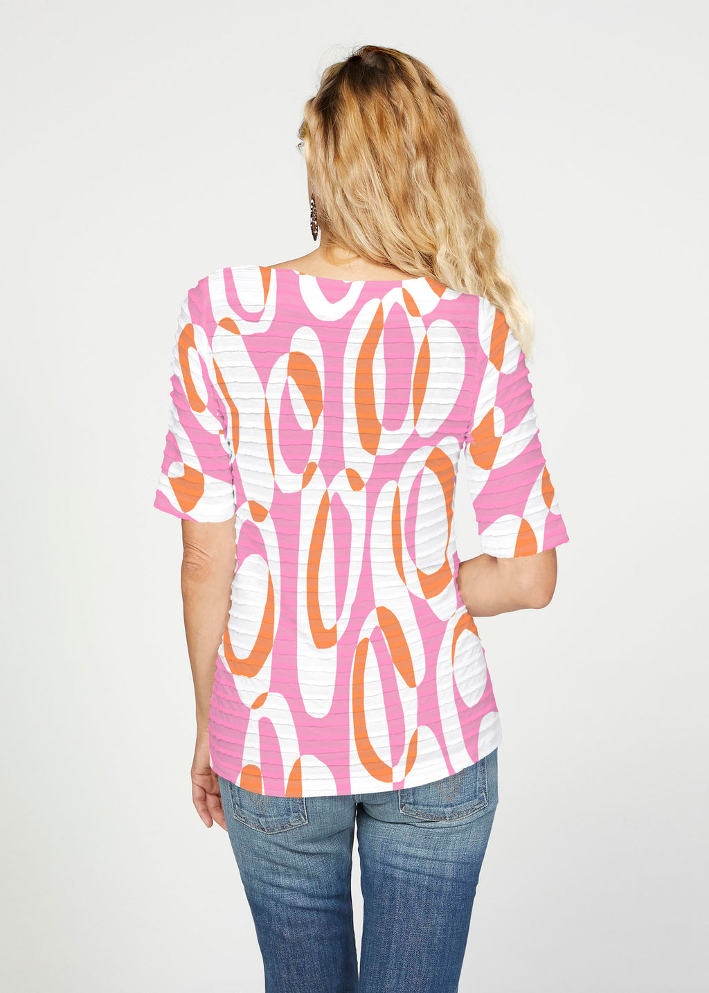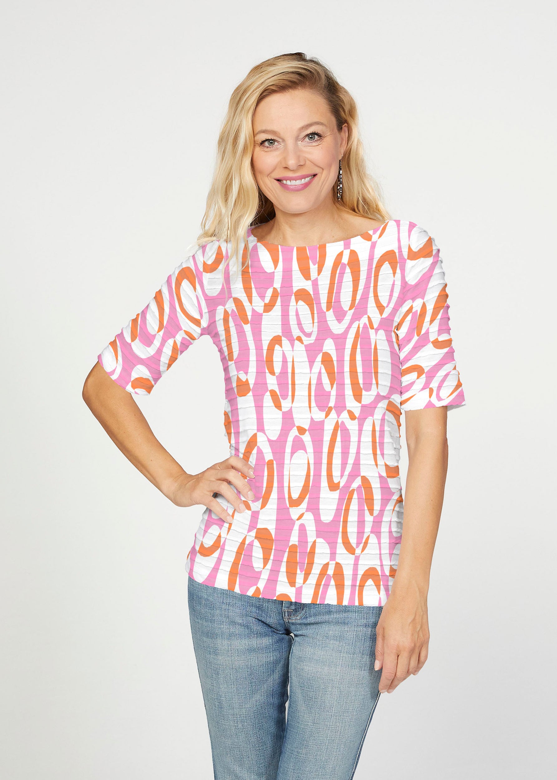 The uniquely soft, pleated texture in this Banded fabric gives the elbow sleeve and boat neck top a fun and sophisticated look. Easy relaxed fit with a hemline that comes below the hip.