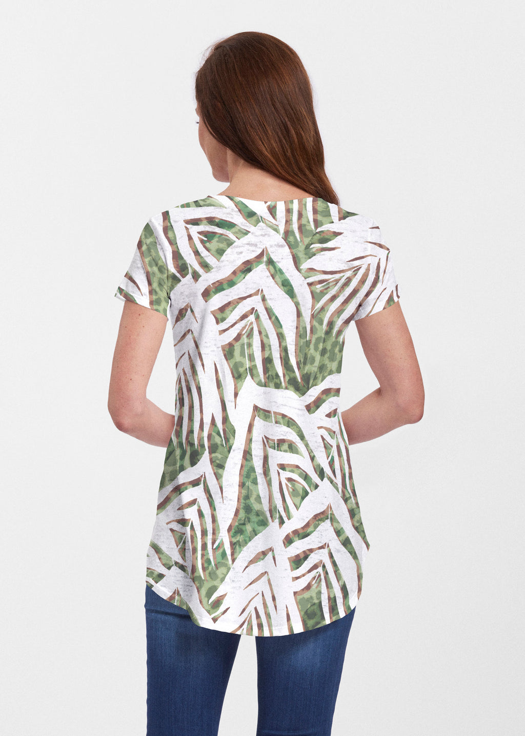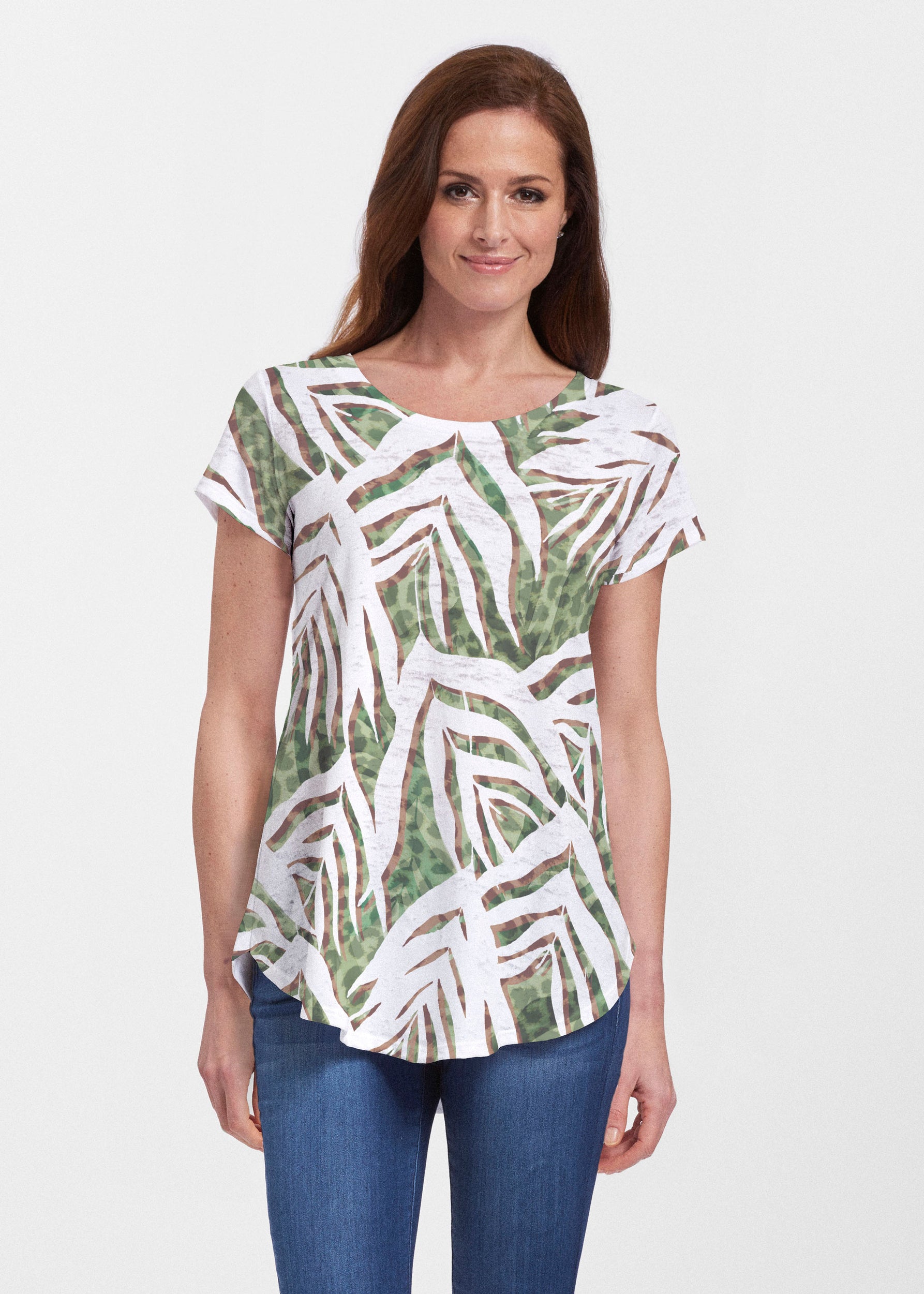 An effortlessly flattering tunic in our soft Signature burnout fabric featuring short sleeves and a scoop neck with a body that flows into a full, swinging shirttail hem.