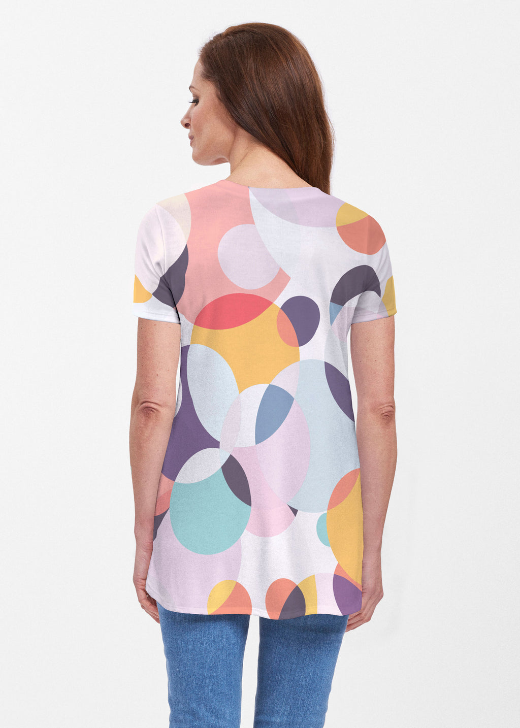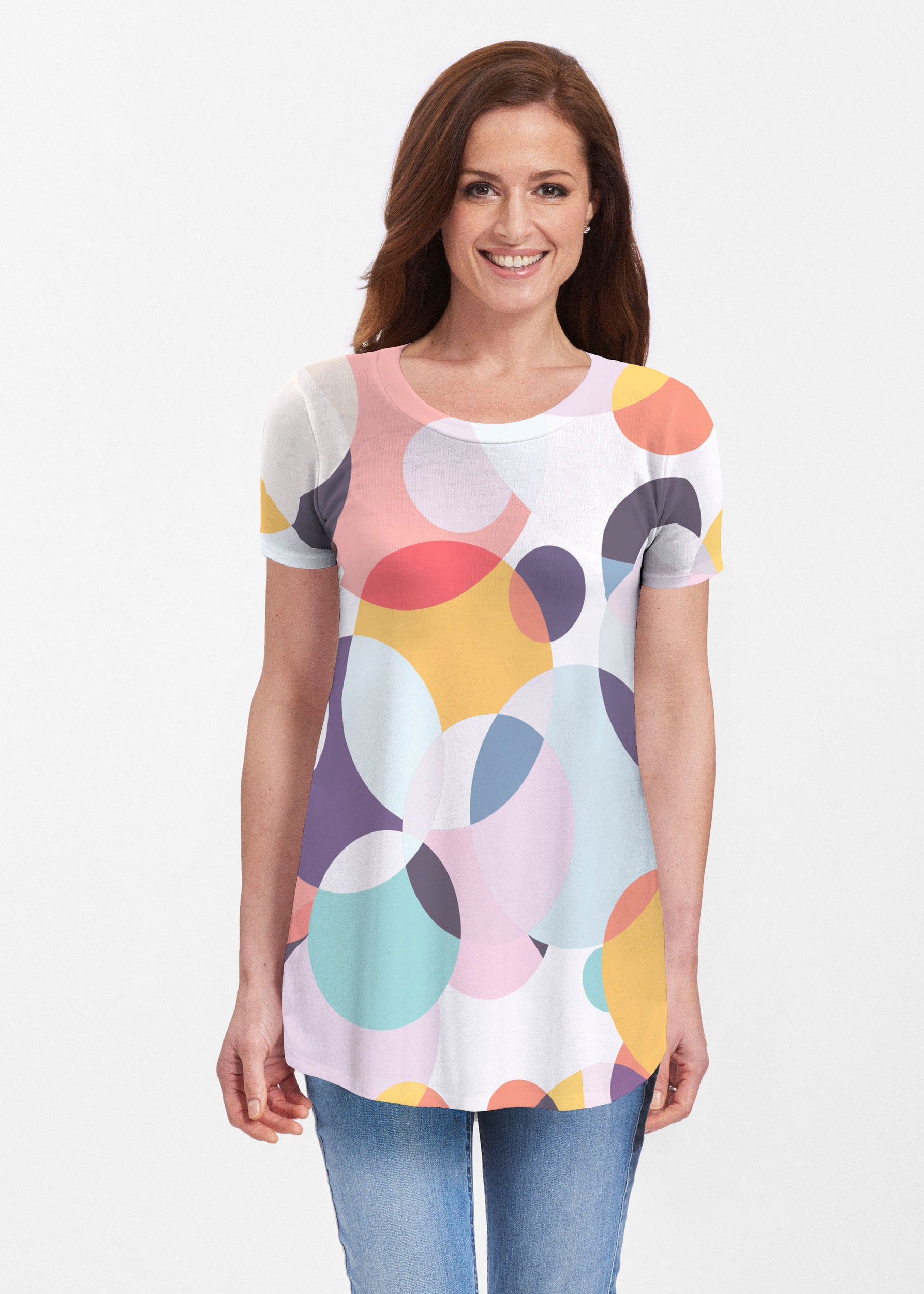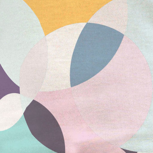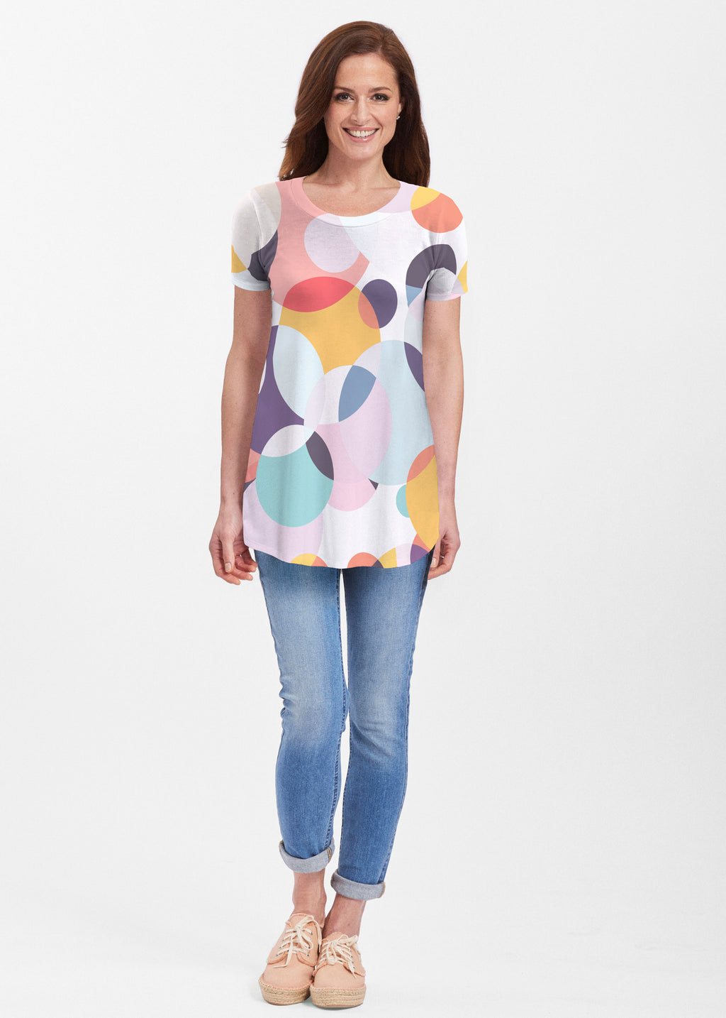 A fun and playful print with bright circles accented with a chevron striped sleeve, designed by Susan Werner.