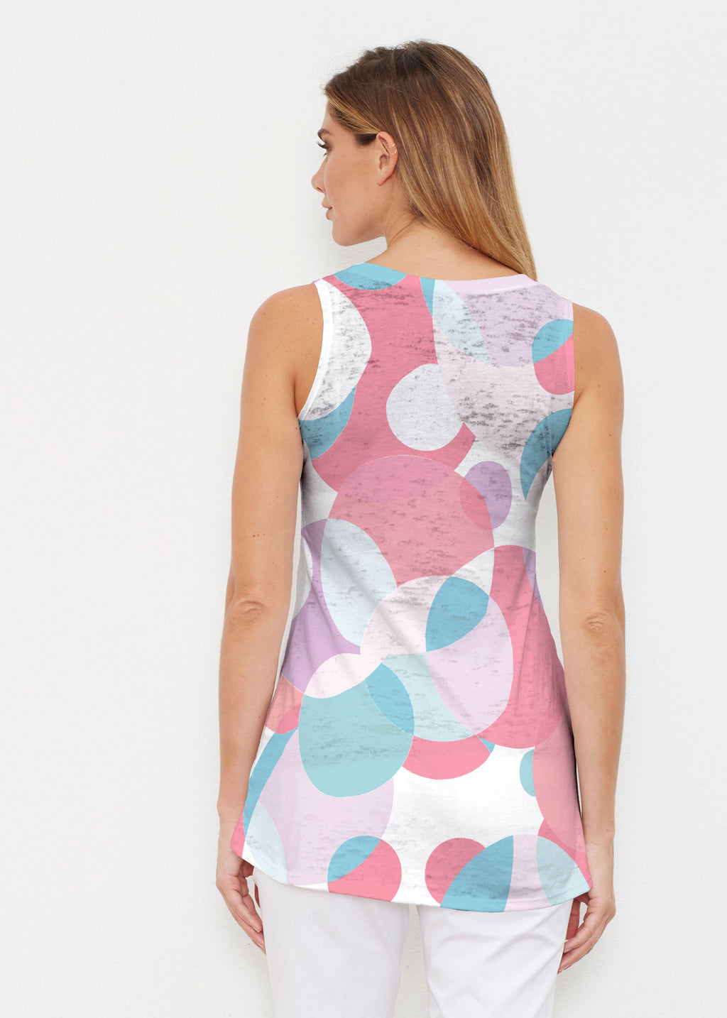 This tank is the perfect combination of an elegant shape with a sporty look. A high-low cascading hemline falls loosely over the hip in our Signature burnout fabric. No sleeves and a shallow scoop neckline give this tank its sporty vibe. -- Your one-of-a-kind garment is created using all-over soft garment sublimation printing. Selected designs are individually printed into your garment. Cotton/Polyester blend.