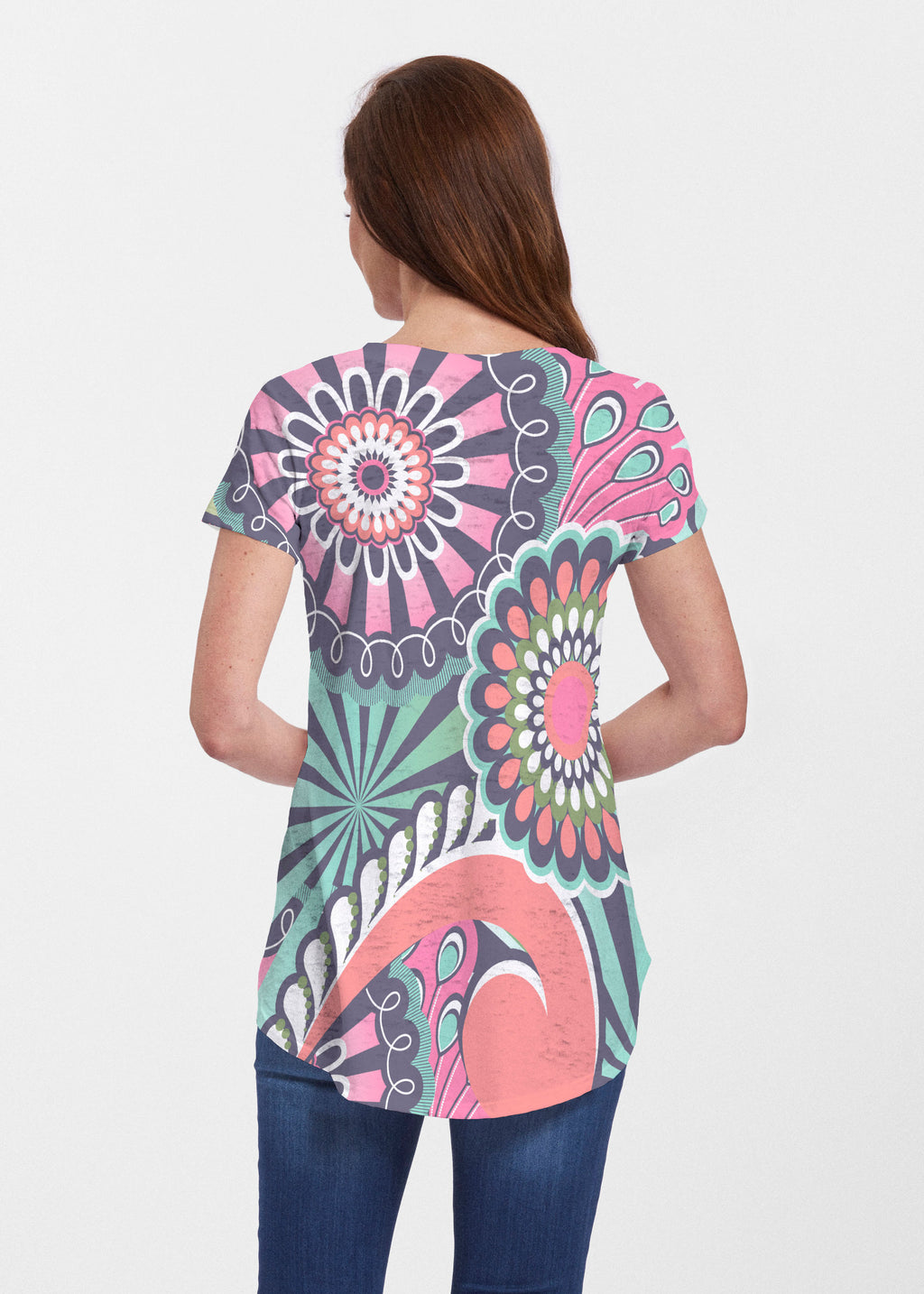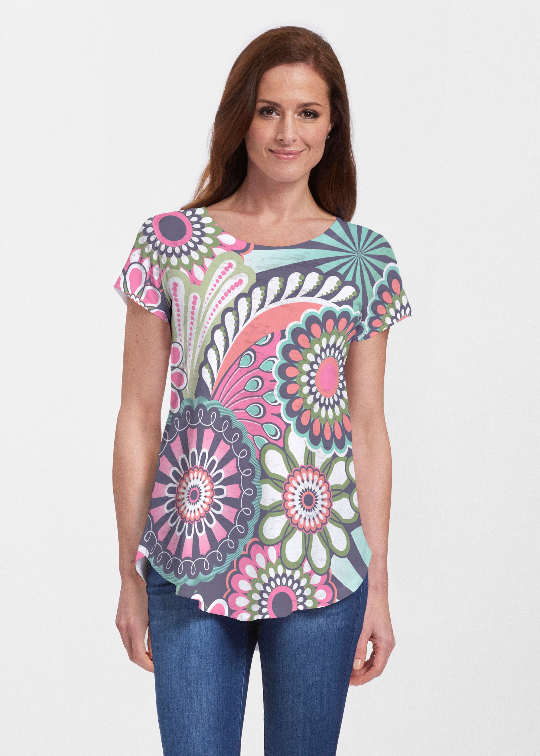 An effortlessly flattering tunic in our soft Signature burnout fabric featuring short sleeves and a scoop neck with a body that flows into a full, swinging shirttail hem.