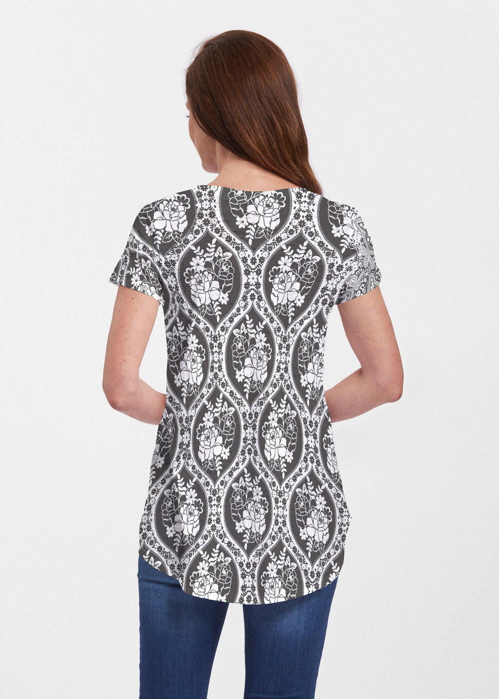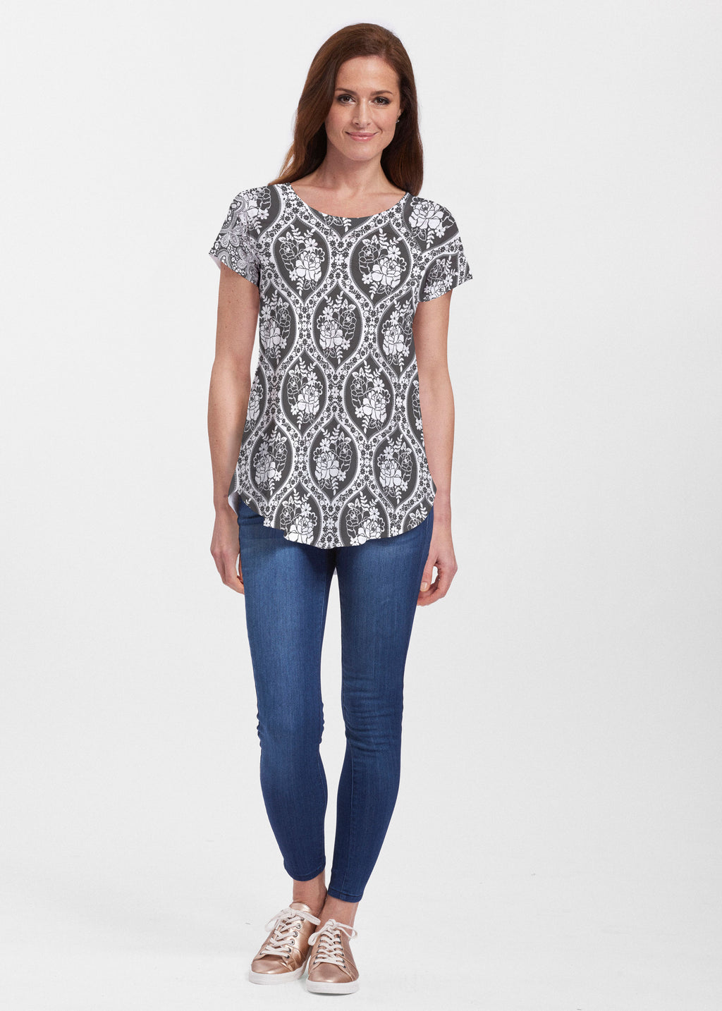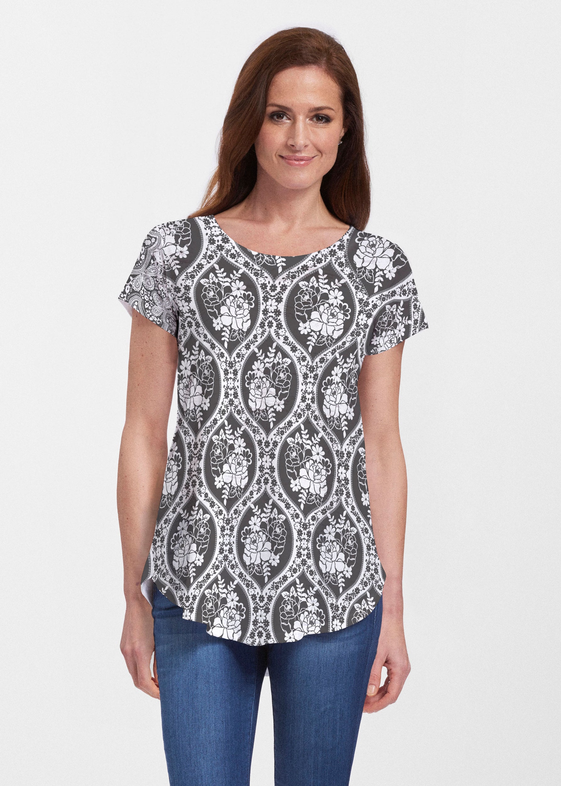 An effortlessly flattering tunic in our soft Signature burnout fabric featuring short sleeves and a scoop neck with a body that flows into a full, swinging shirttail hem.