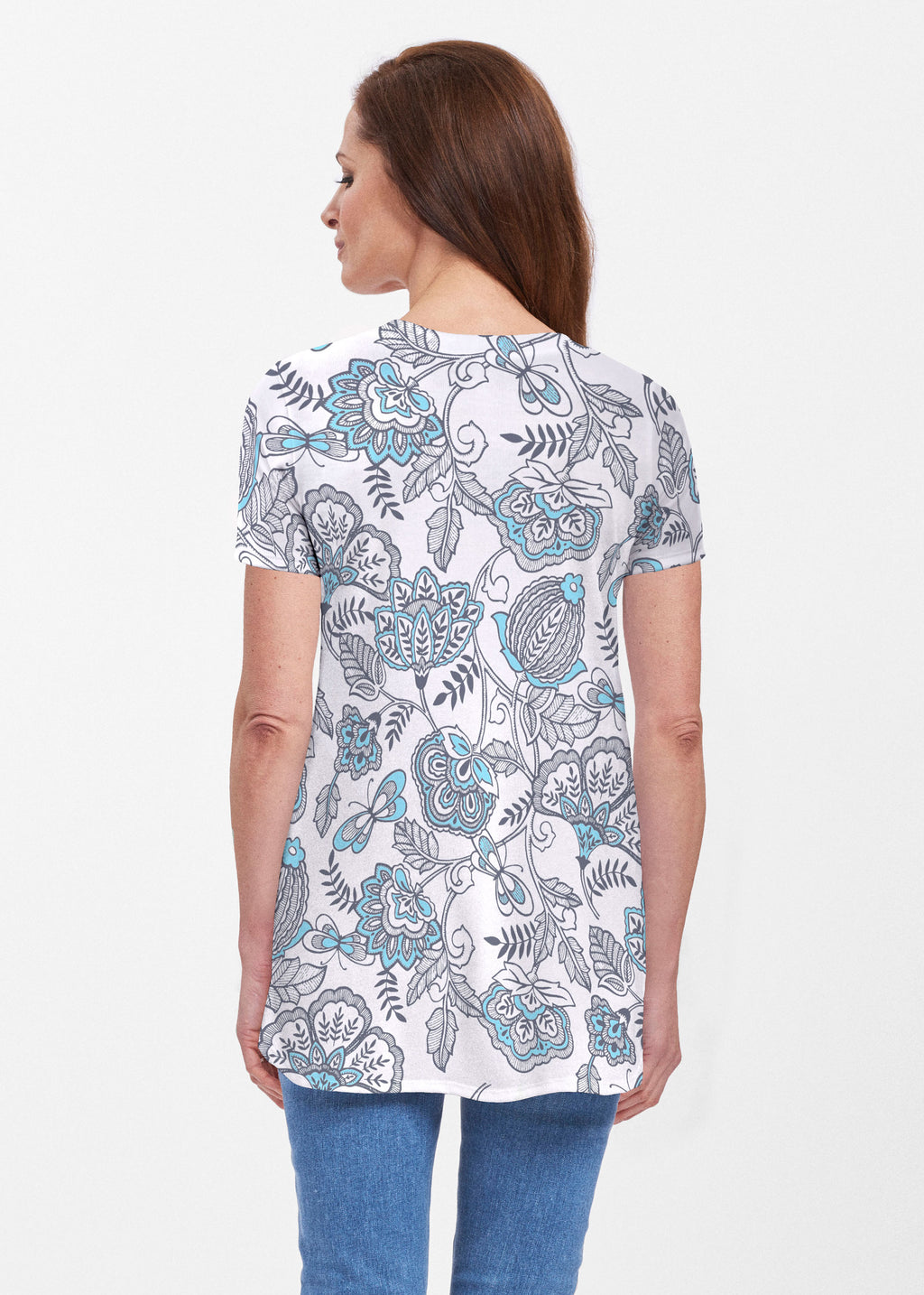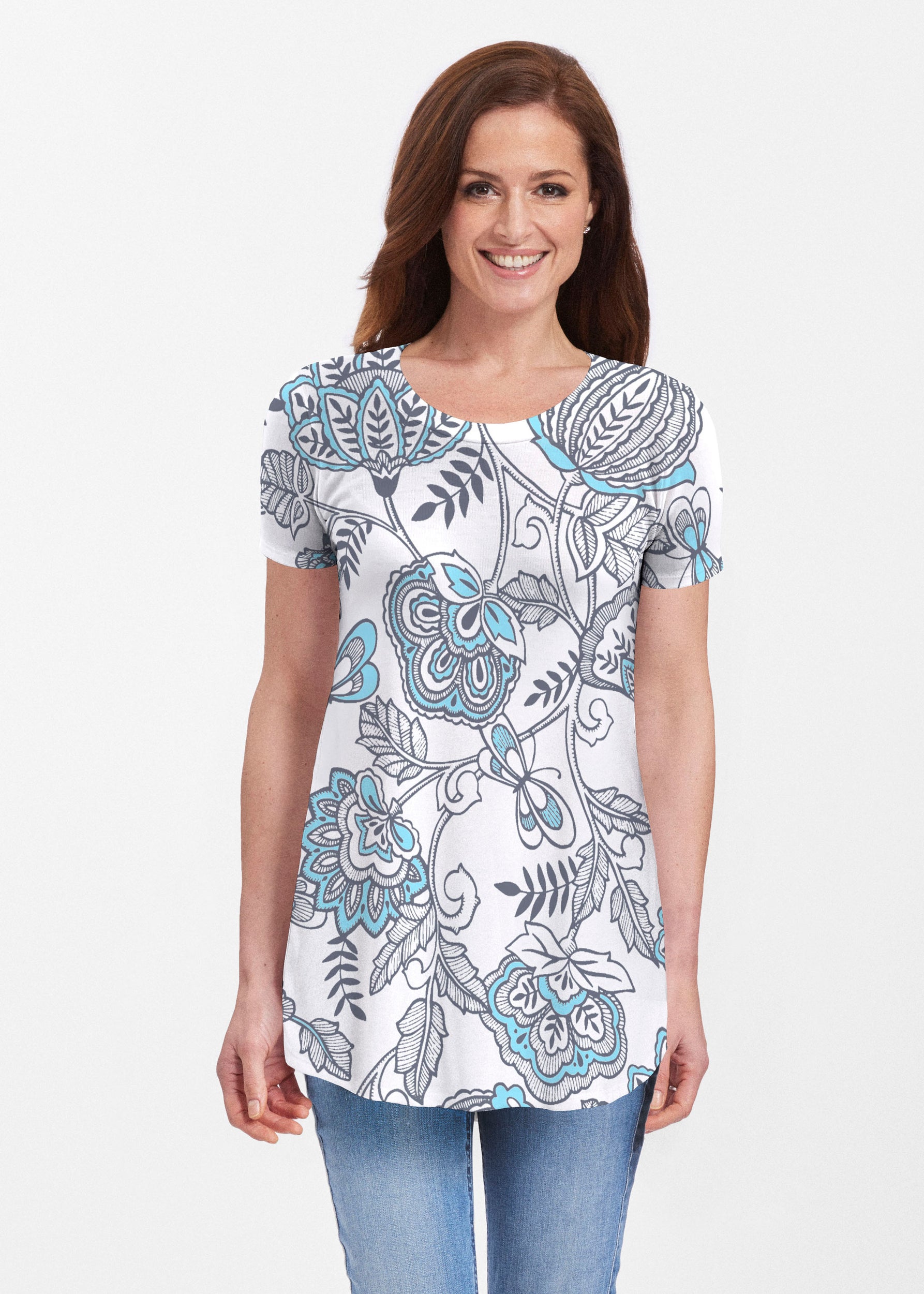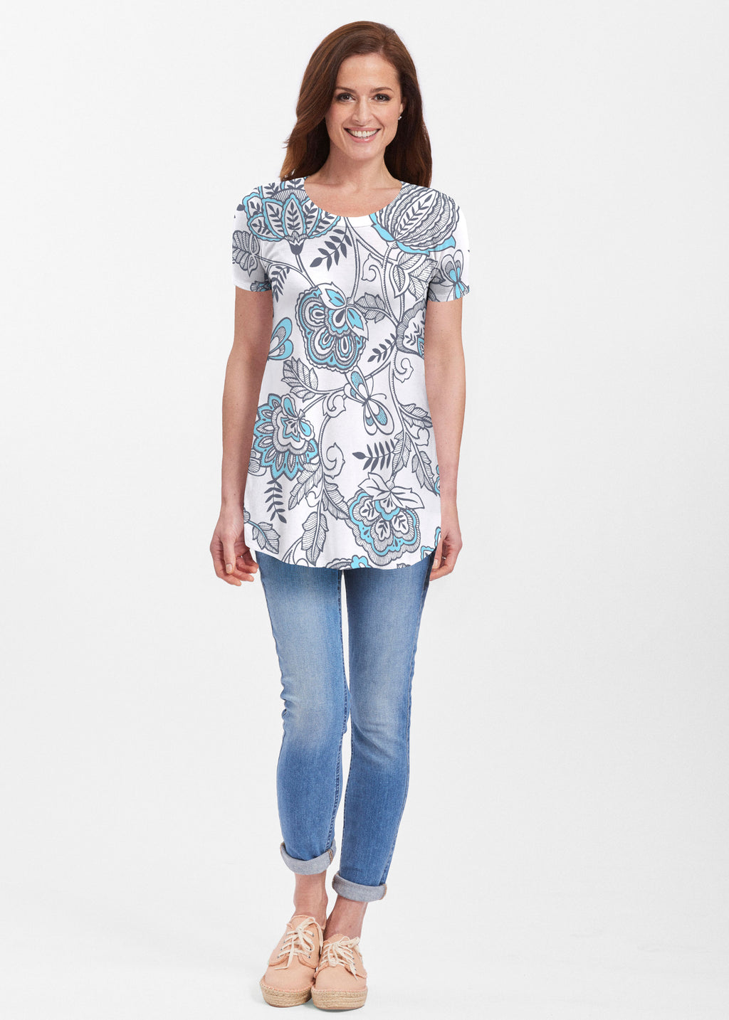 Our soft and feminine short sleeve silhouette tunic is sure to flatter any figure. Made in our Butterknit fabic that flows into a relaxed curved hem that is slightly longer in the back with subtle side slits.