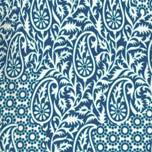 An intermix of our paisley and little sun's prints in white & navy with a green stroke.