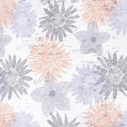 A mix of bold flowers in navy, light blue and orange with artistic lines marking the back designed by Susan Werner.