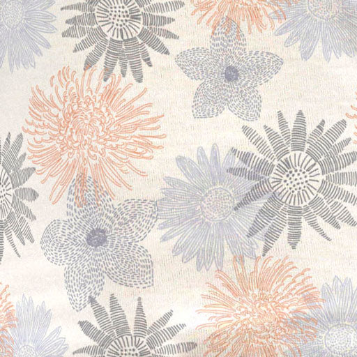 A mix of bold flowers in navy, light blue and orange with artistic lines marking the back designed by Susan Werner.