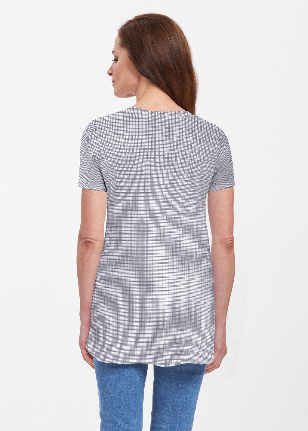 Our soft and feminine short sleeve silhouette tunic is sure to flatter any figure. Made in our Butterknit fabic that flows into a relaxed curved hem that is slightly longer in the back with subtle side slits.