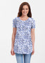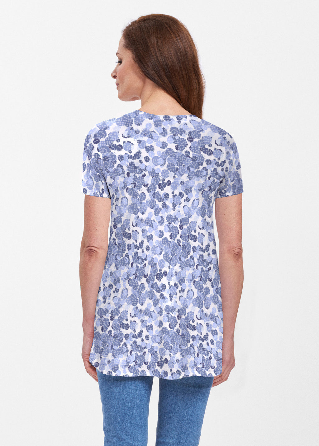 A fun print of mottled dots with chevron inspired mixed sleeves in a beautiful spectrum of blues designed by Susan Werner.