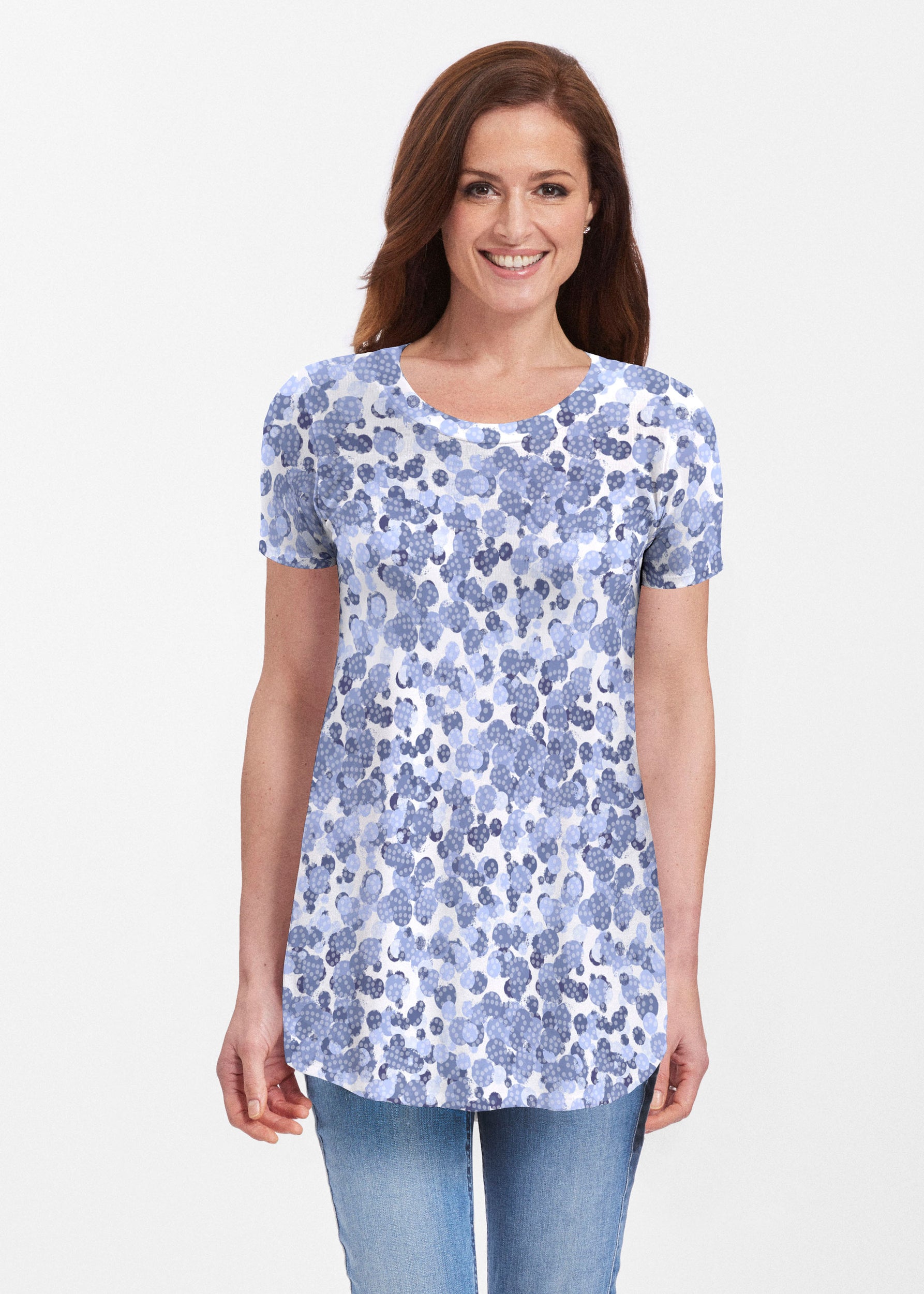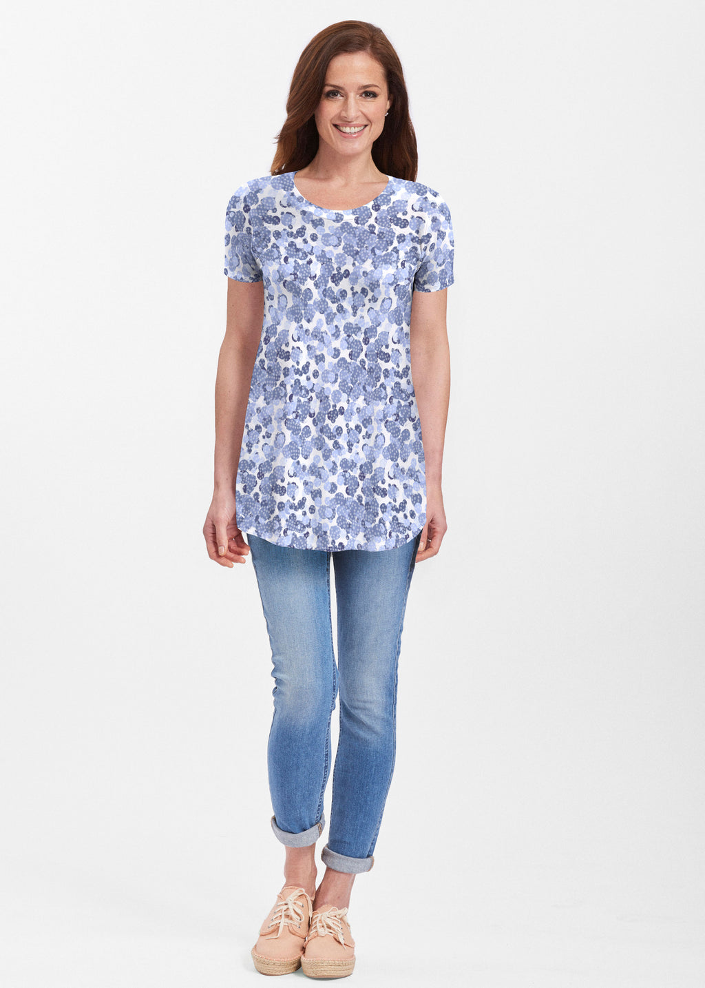 Our soft and feminine short sleeve silhouette tunic is sure to flatter any figure. Made in our Butterknit fabic that flows into a relaxed curved hem that is slightly longer in the back with subtle side slits.