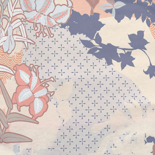 A beautiful boho print with a mix of lily florals layered with geometric shapes in neutral colors with a pop of blue. Designed by Susan Werner.