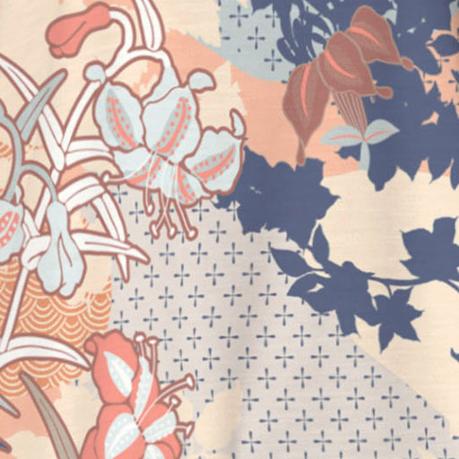 A beautiful boho print with a mix of lily florals layered with geometric shapes in neutral colors with a pop of blue. Designed by Susan Werner.