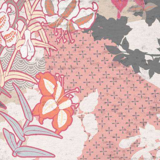 A beautiful boho print with a mix of lily florals layered with geometric shapes in neutral colors with a pop of chocolate brown. Designed by Susan Werner.