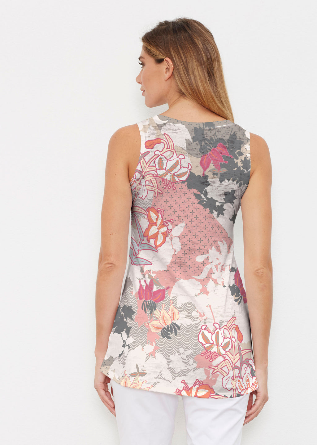 This tank is the perfect combination of an elegant shape with a sporty look. A high-low cascading hemline falls loosely over the hip in our Signature burnout fabric. No sleeves and a shallow scoop neckline give this tank its sporty vibe. -- Your one-of-a-kind garment is created using all-over soft garment sublimation printing. Selected designs are individually printed into your garment. Cotton/Polyester blend.