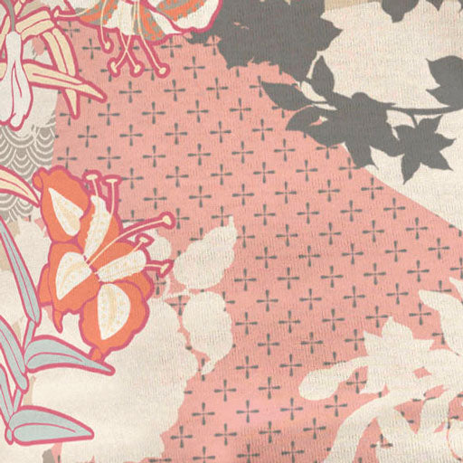 A beautiful boho print with a mix of lily florals layered with geometric shapes in neutral colors with a pop of chocolate brown. Designed by Susan Werner.