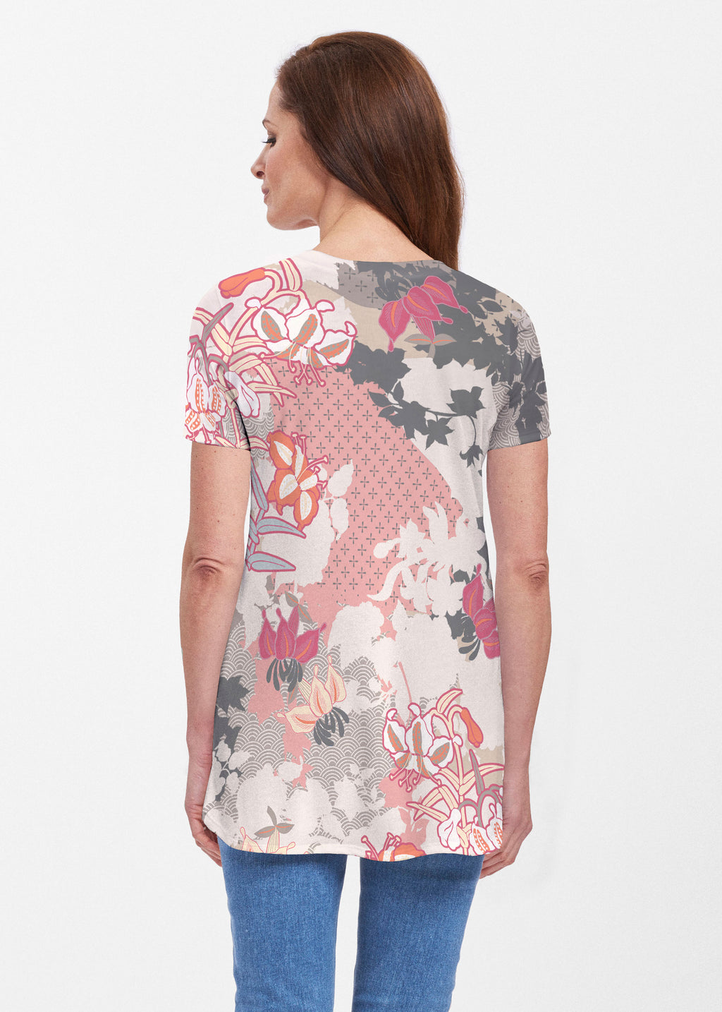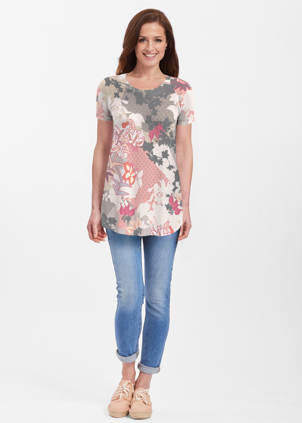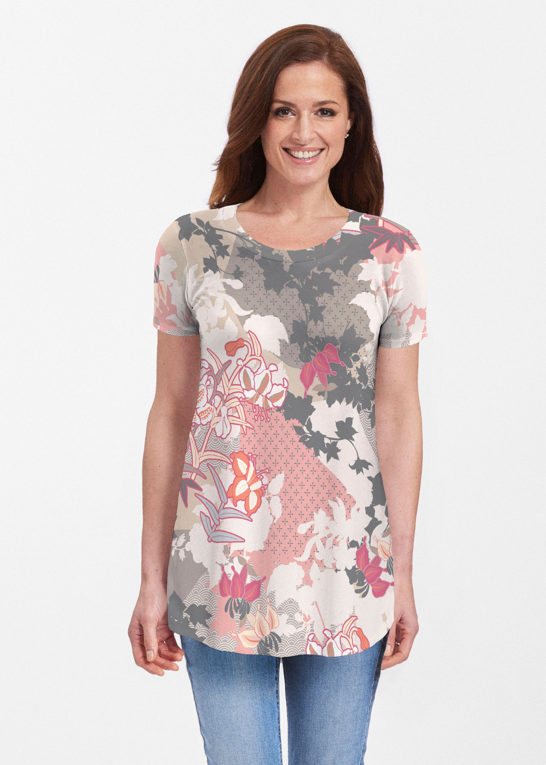Our soft and feminine short sleeve silhouette tunic is sure to flatter any figure. Made in our Butterknit fabic that flows into a relaxed curved hem that is slightly longer in the back with subtle side slits.