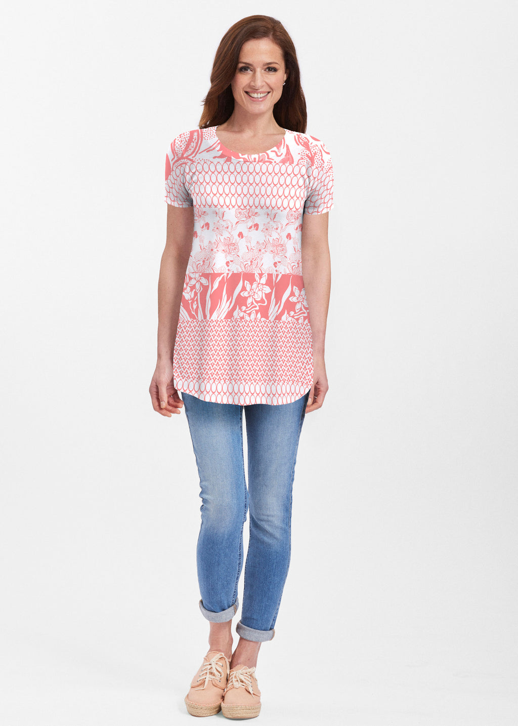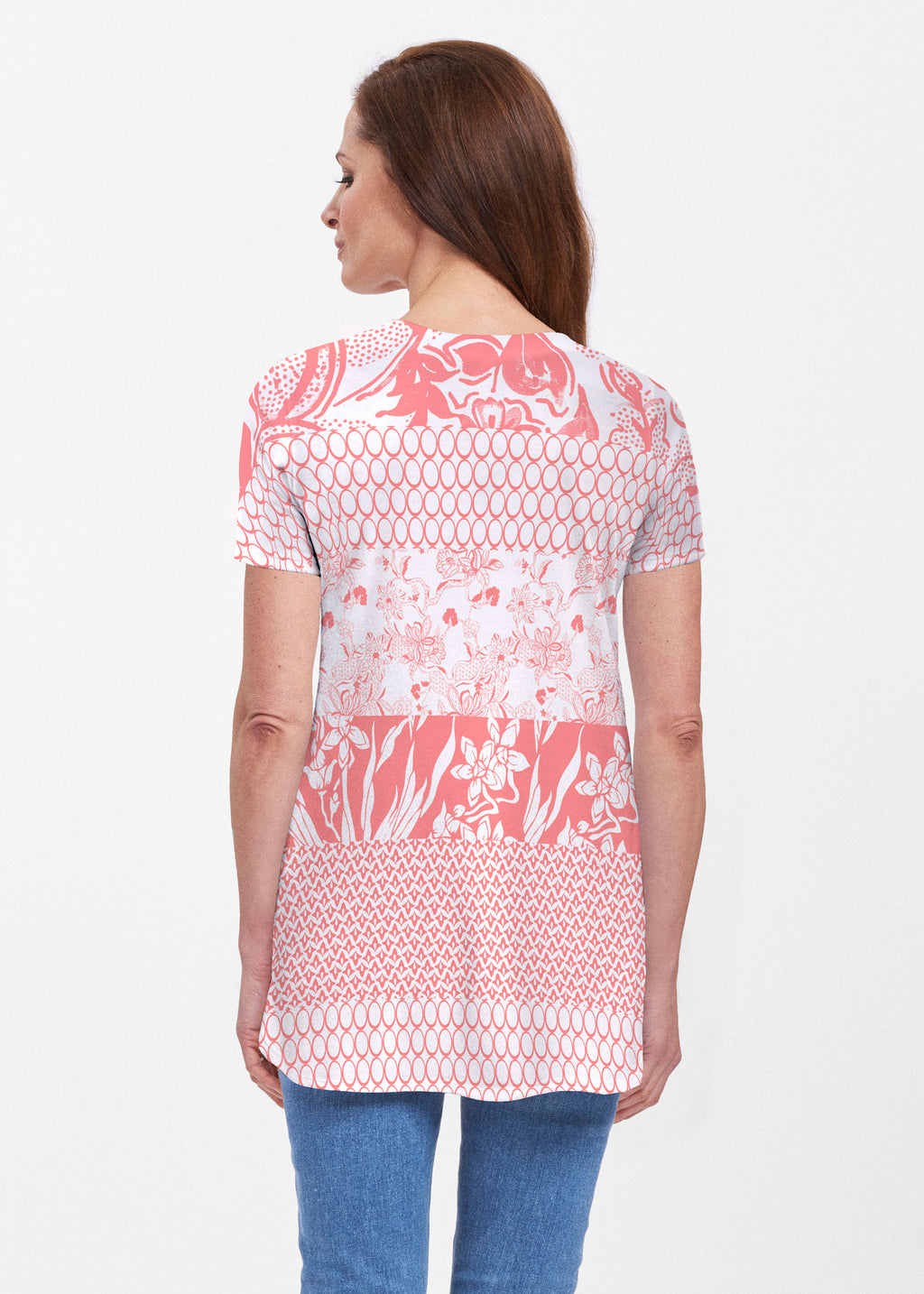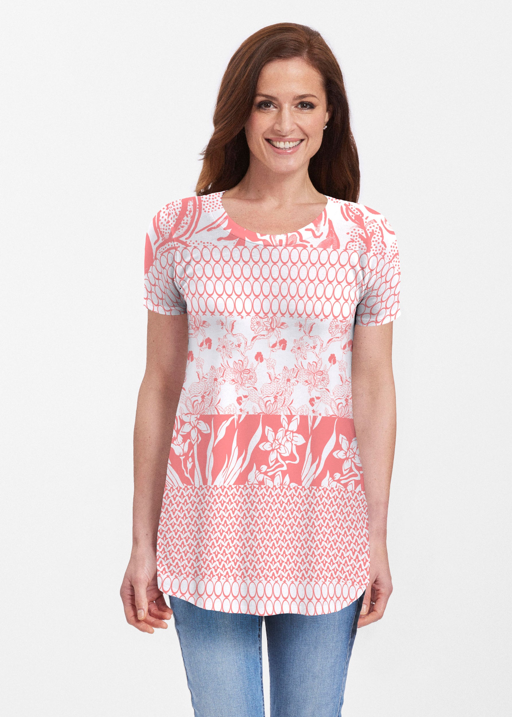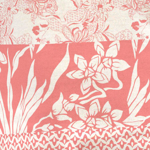 An intricate mix of prints in shades or coral and white make this patchwork print stunning, designed by Susan Werner.