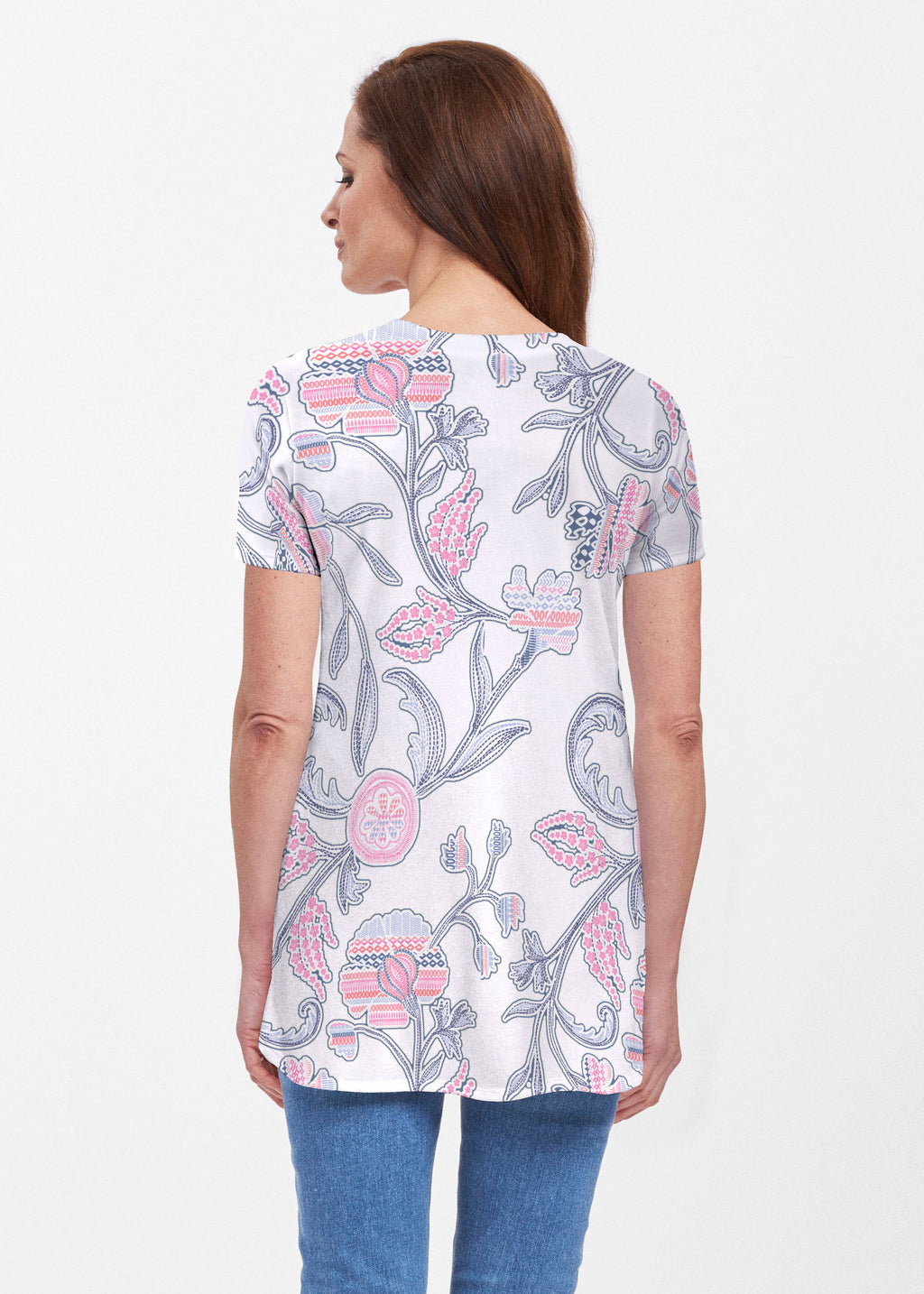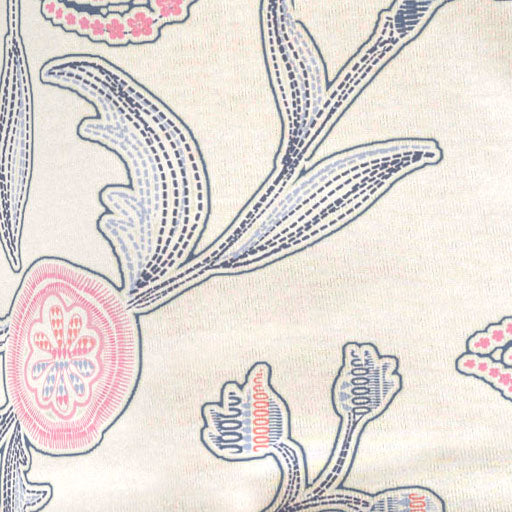 A playful print of stitched floral patterns on a white background and bold mixed sleeves. Designed by Susan Werner.