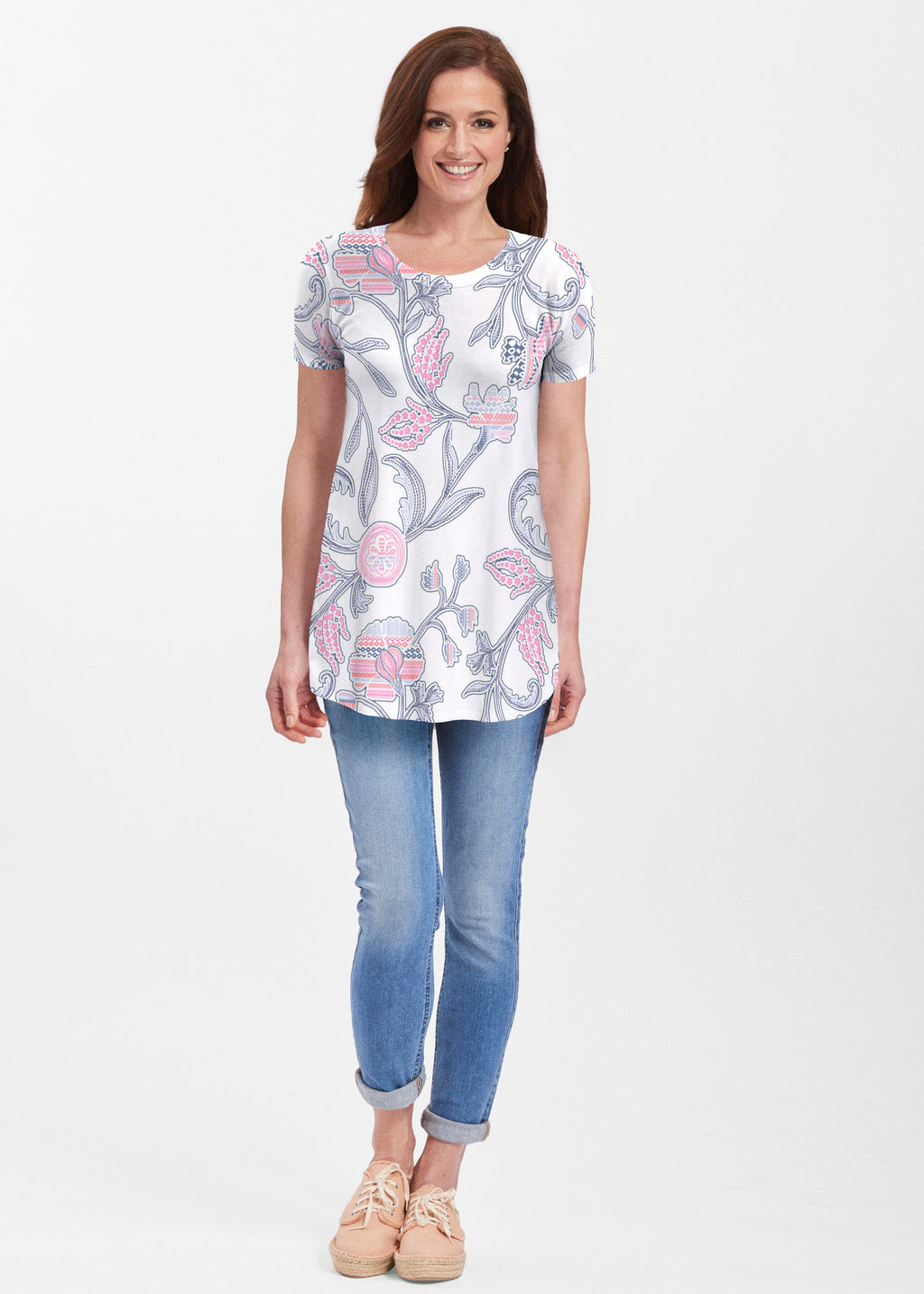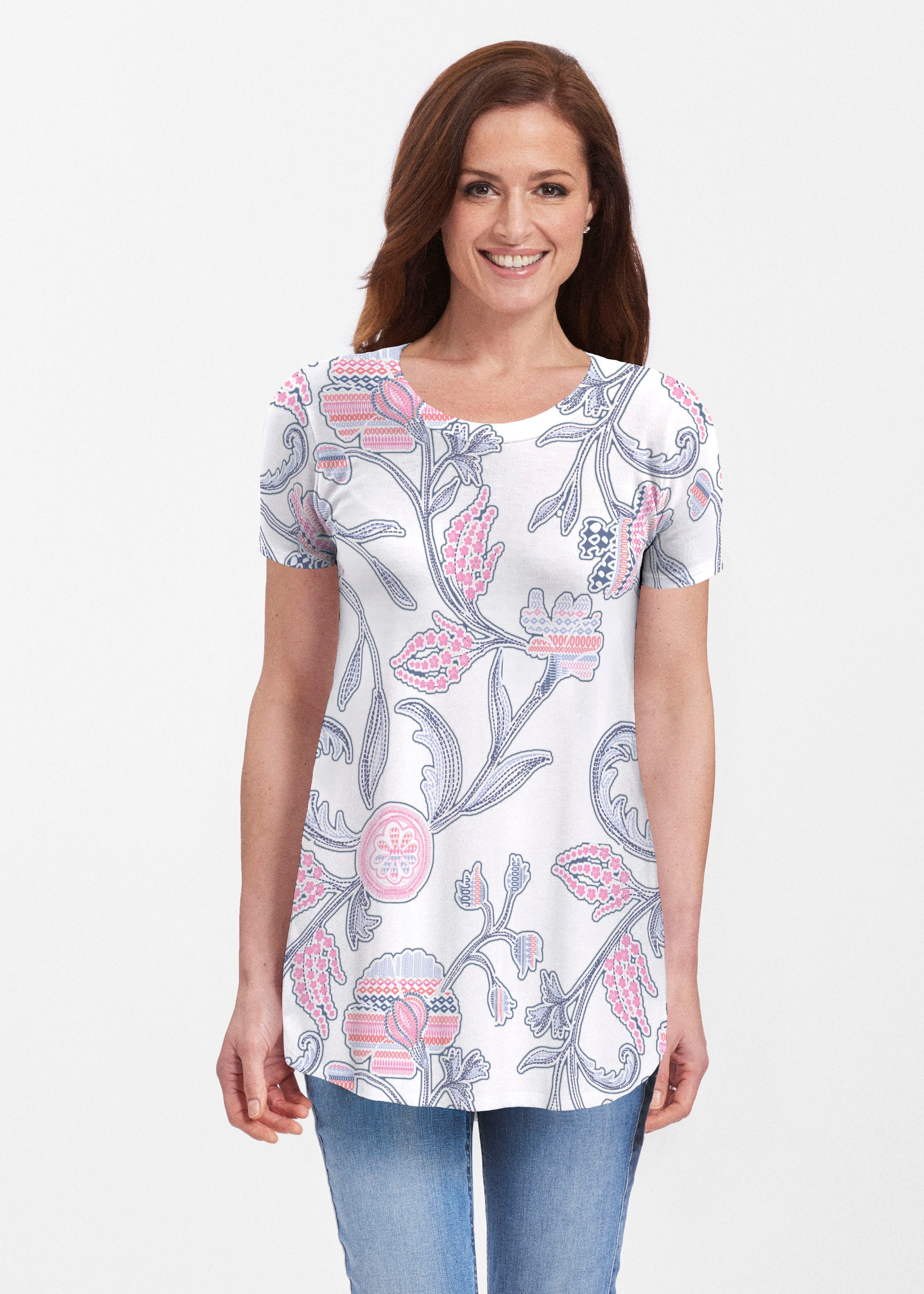 Our soft and feminine short sleeve silhouette tunic is sure to flatter any figure. Made in our Butterknit fabic that flows into a relaxed curved hem that is slightly longer in the back with subtle side slits.