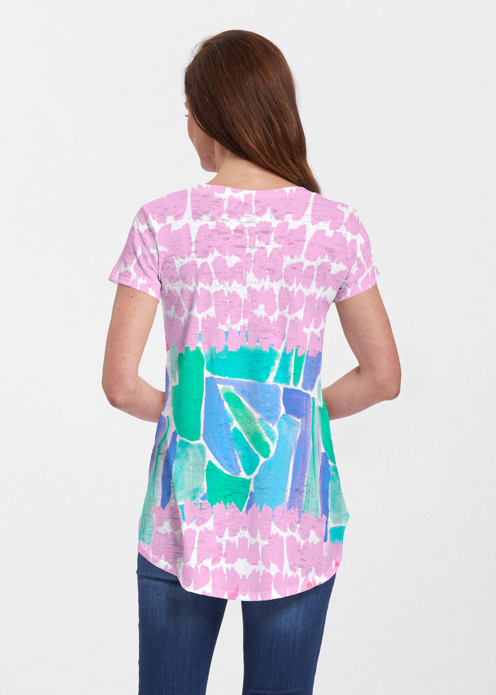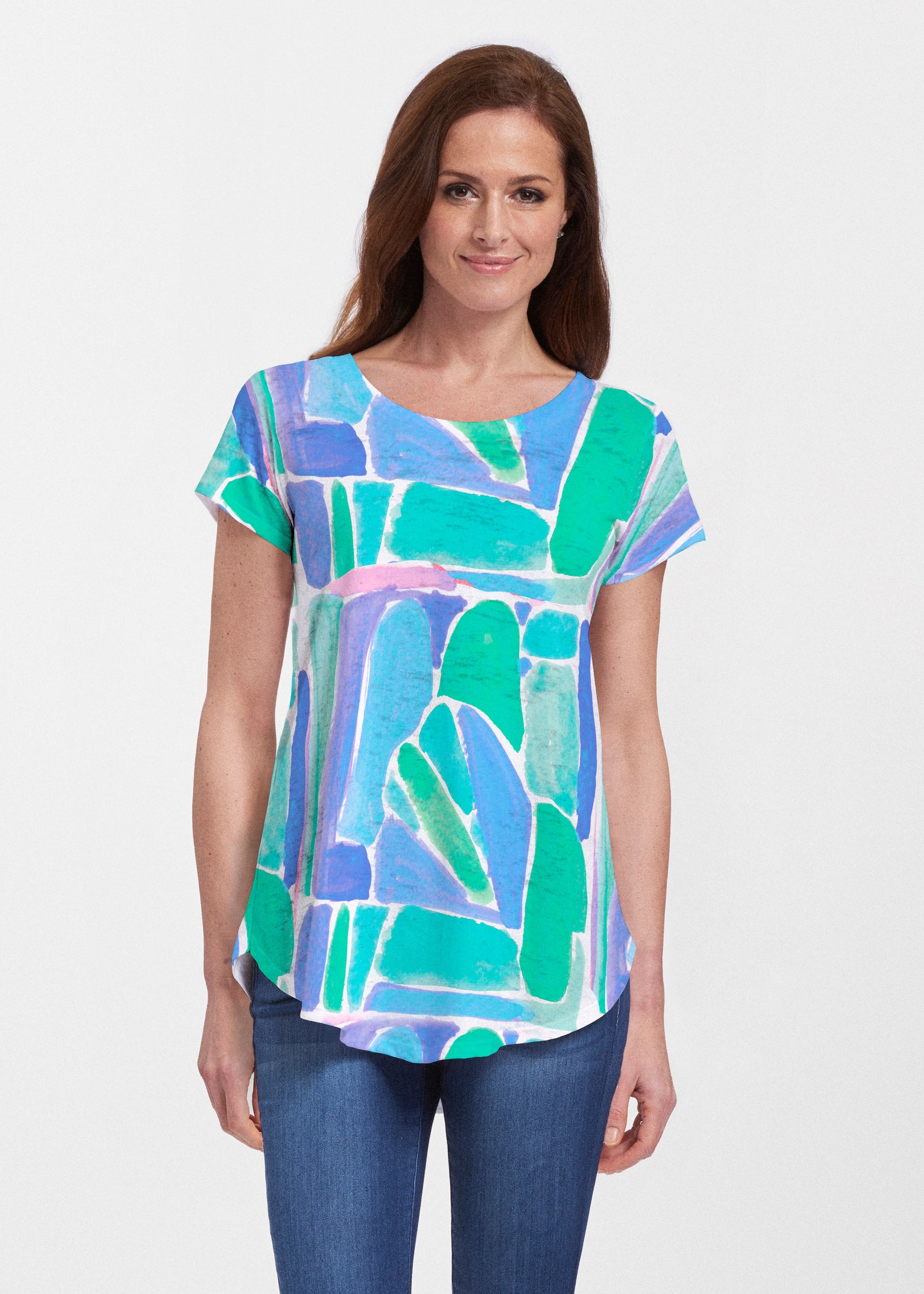 An effortlessly flattering tunic in our soft Signature burnout fabric featuring short sleeves and a scoop neck with a body that flows into a full, swinging shirttail hem.