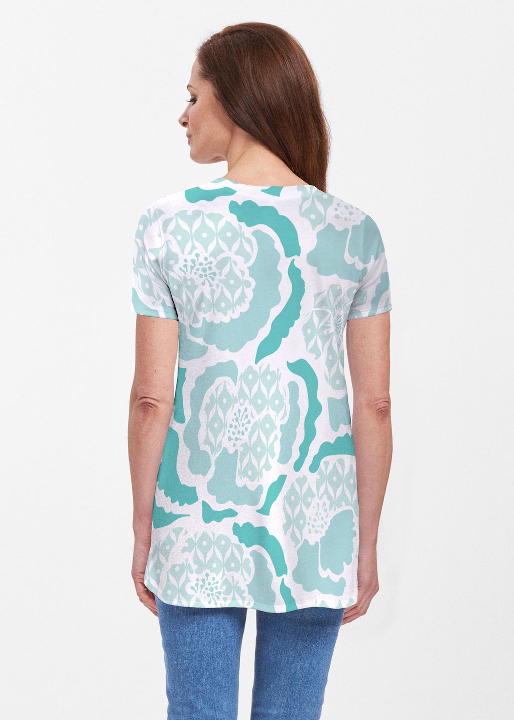 Our soft and feminine short sleeve silhouette tunic is sure to flatter any figure. Made in our Butterknit fabic that flows into a relaxed curved hem that is slightly longer in the back with subtle side slits.
